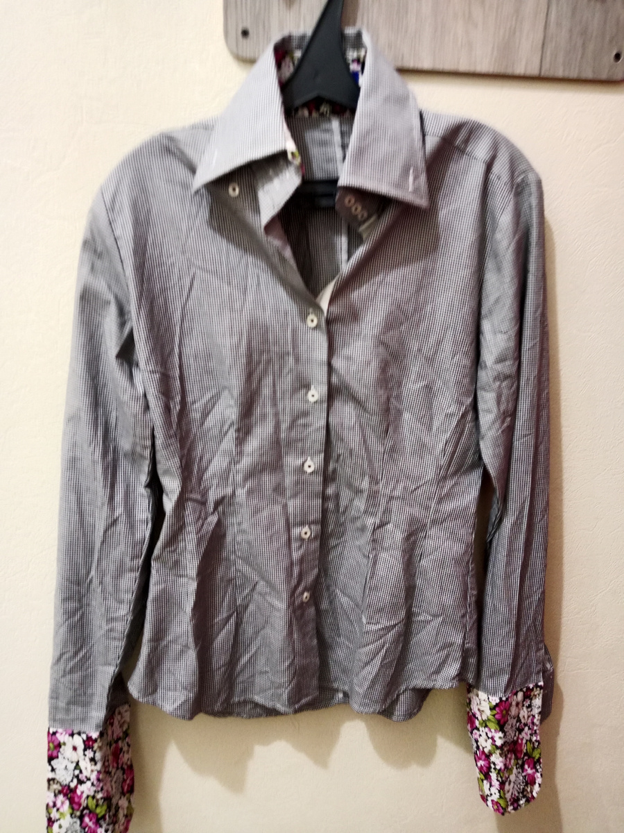 Рубашка укороченная. Планка с контрастными пуговицами. Жёсткий структурированный большой воротник хорошо держит форму. Рубашка коричневого цвета в мелкую клетку. Оригинальный элемент - контрастные широкие манжеты с цветочным рисунком. Вроде и не к месту такие манжеты, а контраст интересен.