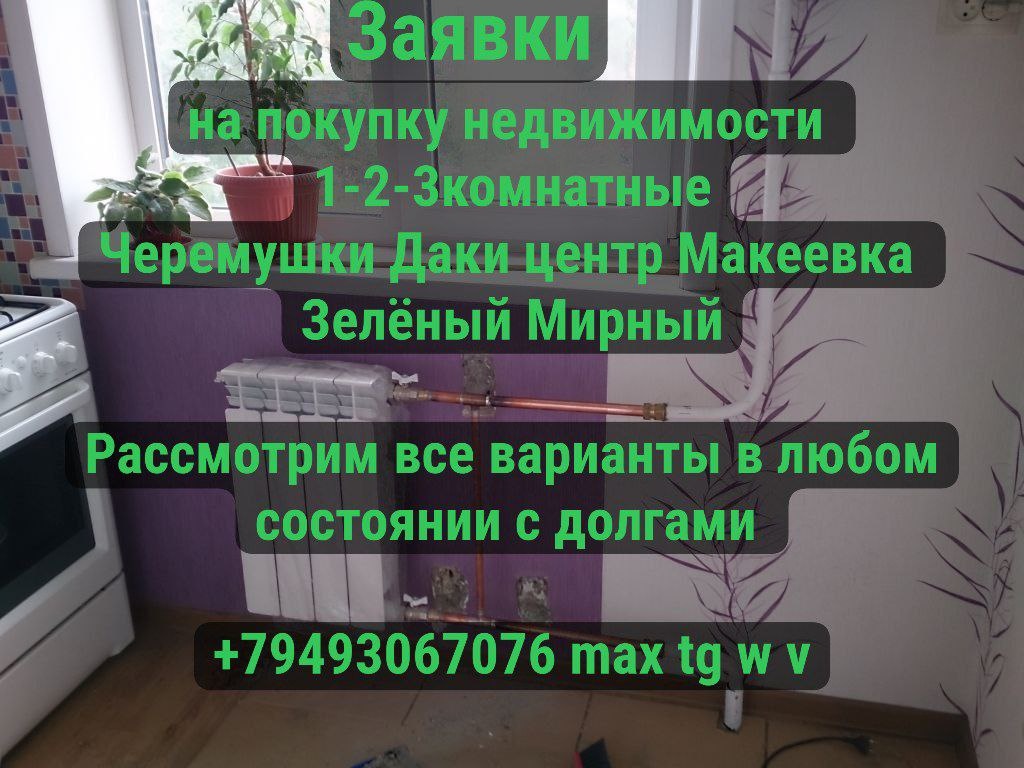 Заявки на покупку недвижимости Куплю 1-2-3комнатные Черемушки Даки центр Макеевка Зелёный Мирный 🏡 Дом 🏠 Центр Планы Осипенко Бажанова Новокалиново Рассмотрим все варианты в любом состоянии с долгами +79493067076 max tg w v