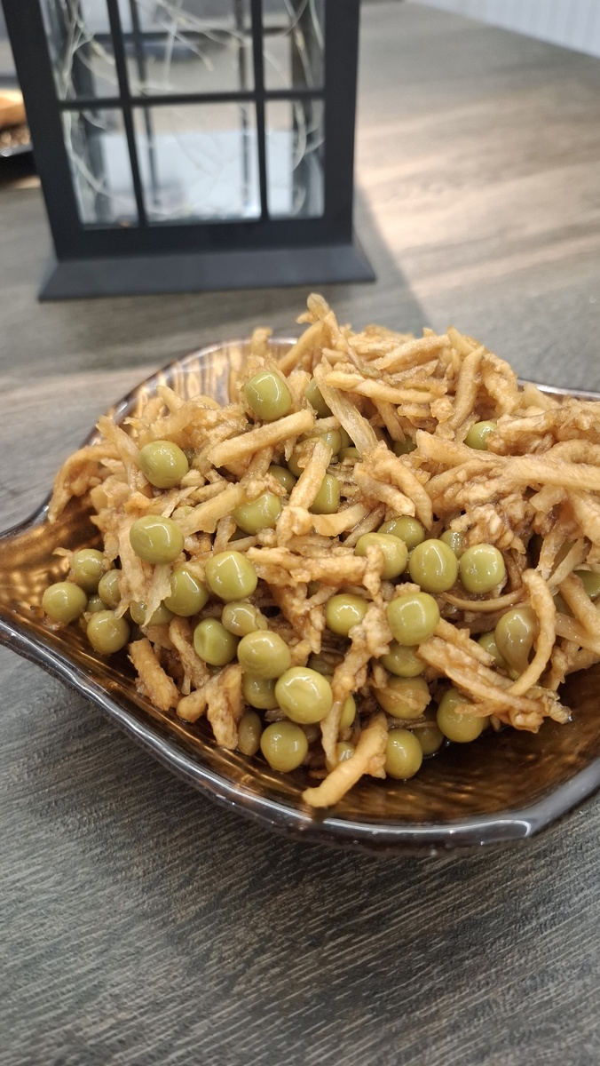 Вот классический рецепт и подробный разбор его полезных свойств. Этот салат очень быстрый в приготовлении, освежающий и с приятной пикантной ноткой. Ингредиенты (на 2-3 порции): · Дайкон (японская редька) — 300-400 г (примерно половина небольшого корнеплода) · Зелёный горошек — 200 г (свежий или замороженный) · Лук зелёный (можно репчатый) — небольшой пучок (3-4 перышка) · Кунжут — 1-2 ст. ложки (для заправки и посыпки) · Растительное масло — 2-3 ст. ложки (лучше всего брать нейтральное: подсолнечное без запаха, рапсовое или рисовое) · Соевый соус — 2-3 ст. ложки (берите качественный, без добавления глютена, если важно) · Лимонный сок — 1 ст. ложка (или рисовый уксус) · Сахар — 0,5-1 ч. ложка (чтобы сбалансировать кислоту и солёность) · Свежий укроп или петрушка — по желанию, для свежести. Пошаговое приготовление: 1. Подготовка дайкона. Дайкон помойте и очистите от кожуры. Натрите его на крупной терке для корейской моркови или нарежьте очень тонкой соломкой. Если дайкон дал много сока