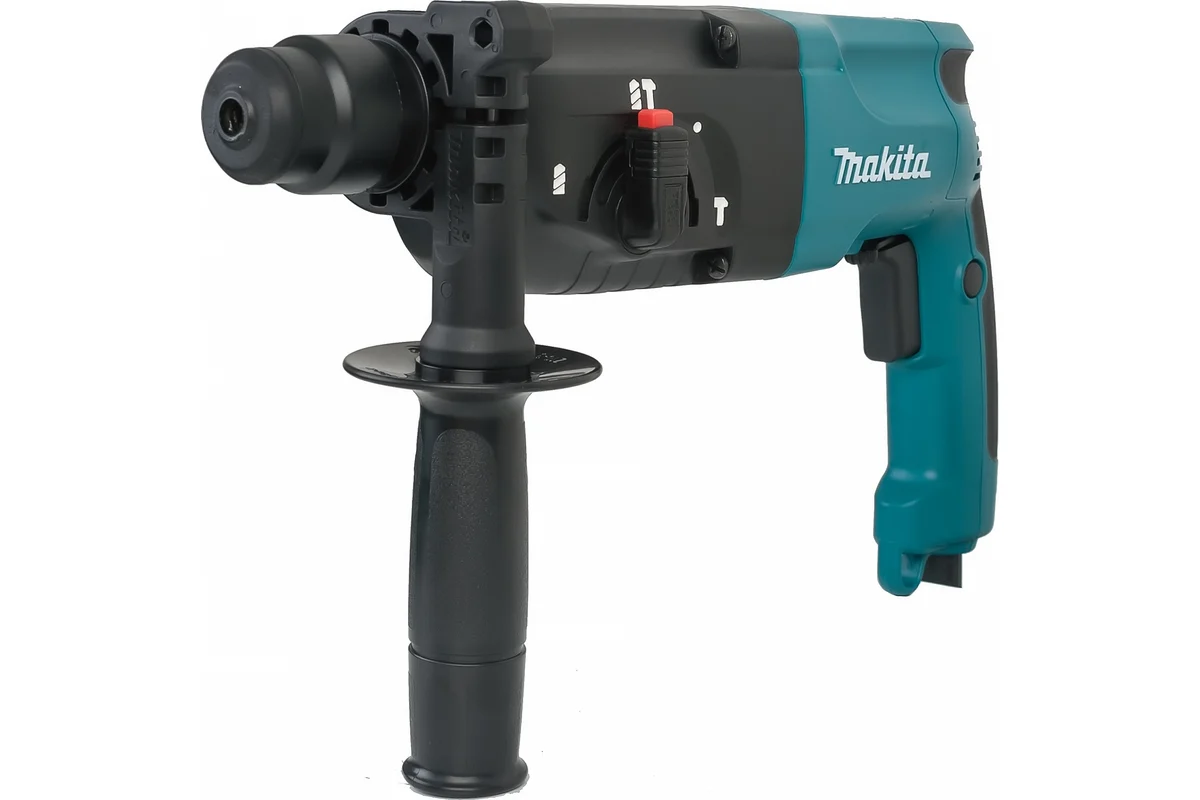 Makita HR 2450 — сетевой перфоратор с тремя режимами и классическим SDS-Plus патроном. Подходит для сверления бетона, работы по дереву и металлу, а также для лёгкого долбления. Мощность двигателя составляет 780 Вт, чего достаточно для бытовых и полупрофессиональных задач. Модель работает от сети 230 В и развивает до 1100 оборотов в минуту. Максимальный диаметр сверления в бетоне — 24 мм. В дереве — до 32 мм, в металле — до 13 мм. При ударном режиме достигается частота до 4500 ударов в минуту, что обеспечивает уверенное бурение в кирпиче и бетоне. Инструмент весит около 2,4 кг. Это средний показатель, подходящий для работ на вертикальных поверхностях, но возможна усталость при длительном использовании без перерыва. Благодаря встроенному переключателю легко сменить режим во время работы. Есть фиксатор положения зубила — можно задать нужный угол для долбления. Также реализована защита от заклинивания за счёт ограничителя крутящего момента. Это снижает риск травм при попадании на арматуру