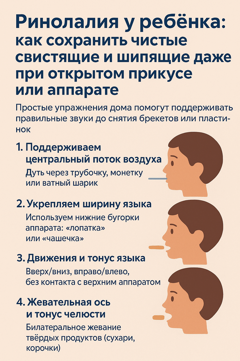 Ринолалия у ребёнка: как сохранить чистые свистящие и шипящие даже при открытом прикусе или аппарате.