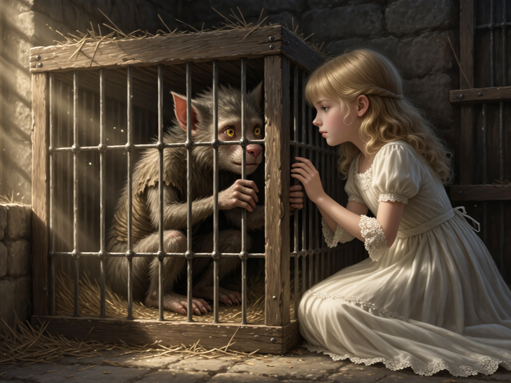 Внезапно дверь приоткрылась, и в щели показалось бледное, испуганное личико. Девочка. Изабелла. В пышном белом платье, с локонами цвета спелой пшеницы, она казалась призраком из того другого мира — мира света и музыки. Ее широко распахнутые глаза, синие, как летнее небо, с любопытством скользнули по клетке и остановились на нем.
