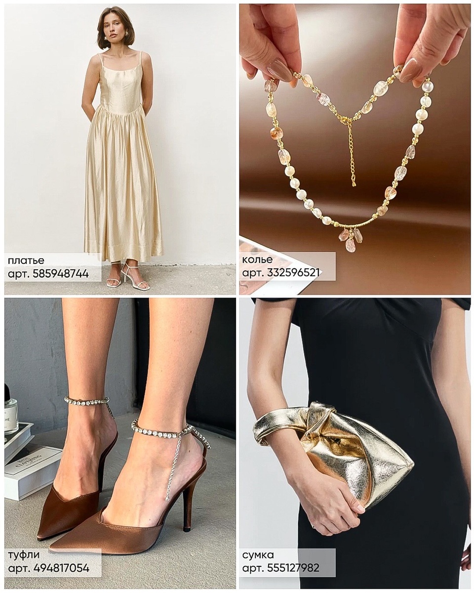 Мир праздничной моды многогранен: он сочетает сияние металлизированных тканей, мягкость атласа, уверенность классических силуэтов и магию аксессуаров, которые превращают даже простой ансамбль в событие. В этой подборке — два роскошных образа с WB, которые созданы для того, чтобы подчеркнуть женственность, грациозность и внутренний свет. Каждый элемент продуман до мелочей: от фактуры ткани до оттенка металла на фурнитуре. Ниже — тщательный разбор всех позиций в порядке арт-номеров, а также советы стилиста, которые помогут раскрыть потенциал каждого образа. ⭐ ОБРАЗ №1. ЗОЛОТАЯ ЛЕГКОСТЬ И ЖЕМЧУЖНОЕ СИЯНИЕ Воздушное золотистое платье длины миди — верх изящества. Тонкие лямки открывают линию плеч, а струящаяся ткань подчёркивает плавность движений. Нежный блеск материала создаёт эффект «мягкого сияния», который идеально подходит как для праздничного вечера, так и для дневных торжеств. Детали: – лёгкая ткань с деликатным сатиновым переливом; – элегантная сборка по талии, создающая естествен