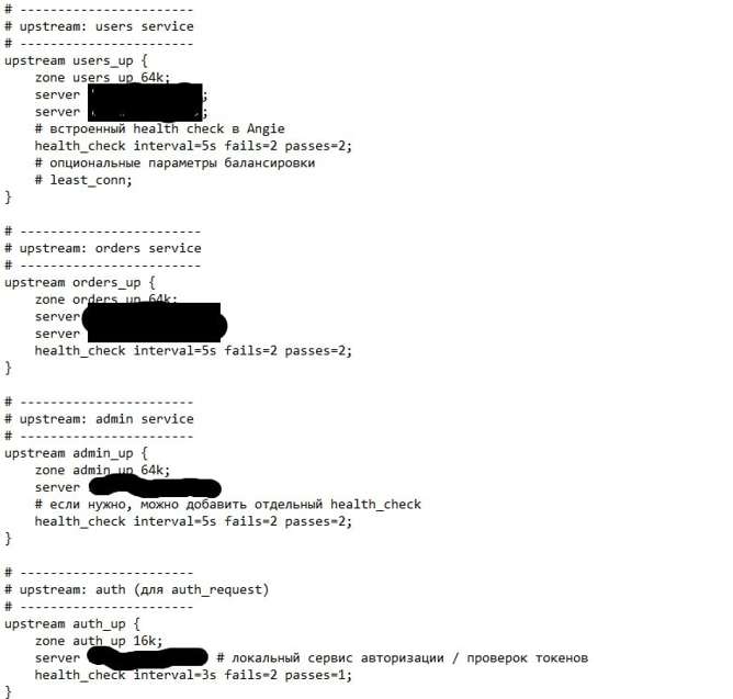 Такой сценарий можно разложить спокойно и без танцев с бубном: разнести сервисы, использовать отдельные upstream-блоки, health-checks и при этом не городить монстра из конфигов — за счёт более современной логики и нормального проектирования.