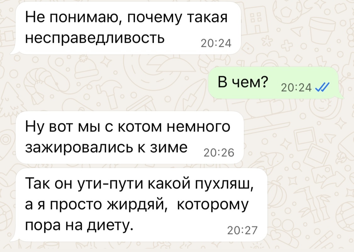 Да, вот такая несправедливость. Котик всегда в любом весе красавчик, а человеку надо стараться и усилия прикладывать, чтобы более-менее сносно выглядеть.