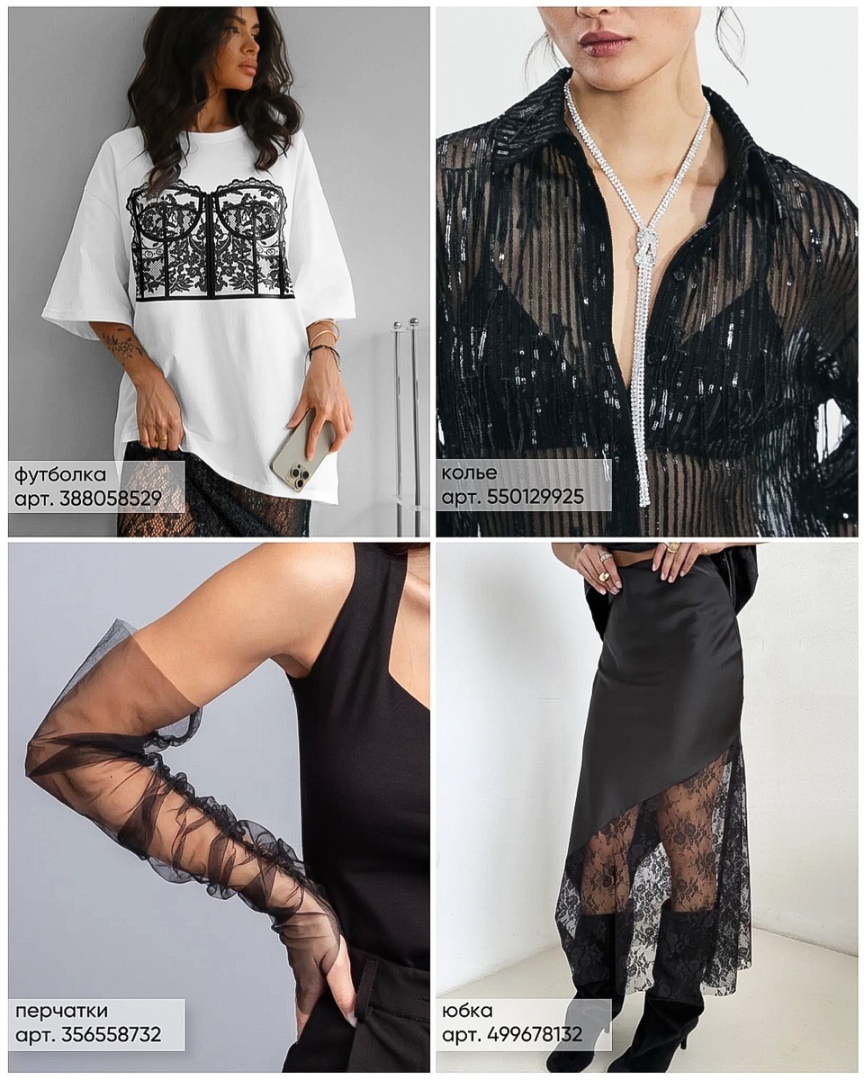 Современная мода ценит не только красоту, но и индивидуальность. Образы, которые мы выбираем, становятся языком самовыражения: они рассказывают о вкусе, характере и настроении. В сегодняшней подборке — два ярких лука с OZON / WB, которые идеально подойдут как для вечернего выхода, так и для эффектных светских мероприятий. Каждый элемент здесь — самостоятельный герой, но вместе они создают цельный, дорого звучащий образ. Разбираем композицию подробно. ✨ ОБРАЗ №1 арт. 388058529 Белая футболка — классика, но в данной модели она приобретает особый характер благодаря черному принту, имитирующему изысканное кружево. Совет стилиста: сочетайте такую футболку с романтичными или прозрачными фактурами, чтобы играть на контрасте нежности и дерзости. арт. 550129925 Идеальное украшение, если хочется добавить в образ светского шика: Совет стилиста: такое колье лучше всего носить с глубоким вырезом или полупрозрачным верхом. арт. 356558732 Тонкие, почти невесомые перчатки из сетчатой ткани — абсолю