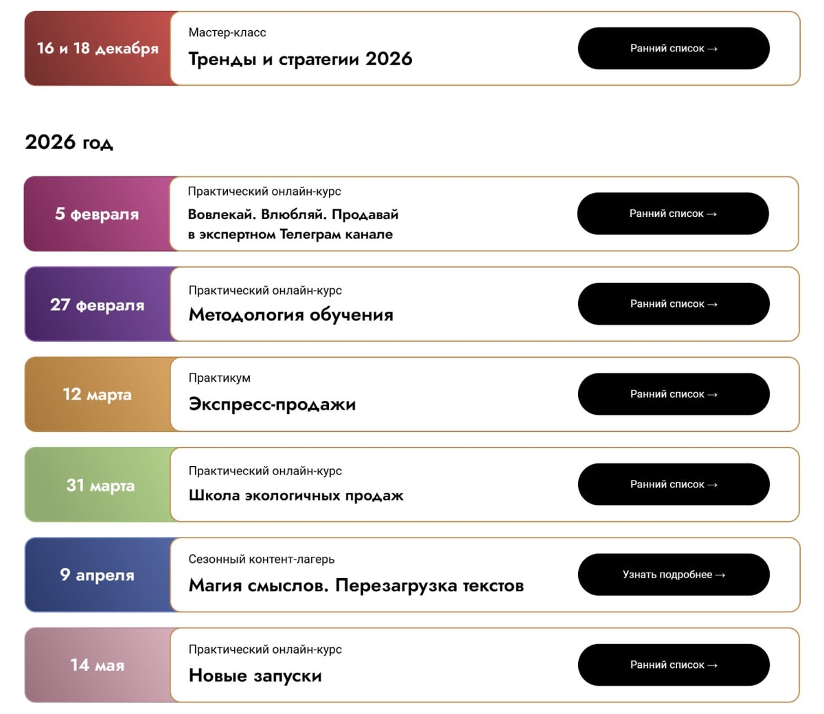 ⚡️ Расписание курсов и тренингов 2026. Первое полугодие 👇🏻 5 февраля - курс "ВВП. Вовлекай. Влюбляй. Продавай" в экспертном Телеграм канале Полное пошаговое руководство по системной монетизации экспертных Телеграм каналов в 2026 гг. без бюджета 👉🏻 Записаться в лист ожидания 27 февраля - курс "Методология" NEW. Как создавать и вести продукты, которые дают реальный результат. Методики высоко конверсионных программ с ВАУ-кейсами, которые продают себя сами. 👉🏻 Записаться в лист ожидания 12 марта - практикум "Экспресс-продажи" Техники быстрых продаж без долгих изматывающих прогревов, тупого спама, "серых" способов ... и даже без блога. 👉🏻 Записаться в лист ожидания 31 марта - курс "Школа экологичных продаж" NEW. Полный алгоритм как продавать дороже и чаще - без скриптов, стресса и навязчивости. От первого касания с клиентом до выстраивания вашей рабочей, постоянно растущей системы продаж. 👉🏻 Записаться в лист ожидания 9 апреля - сезонный контент-лагерь "Магия Смыслов
