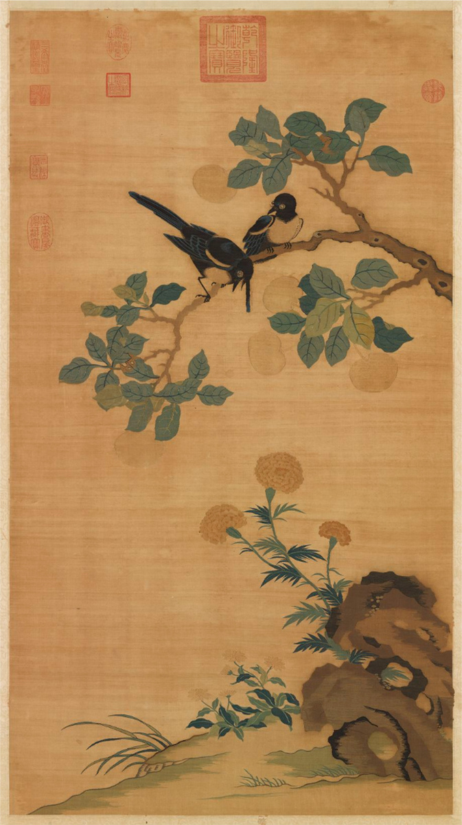 плодами — будто обсуждают важные вещи. А под ними — хризантемы, растущие рядом с причудливым камнем. Композиция воздушна, пронизана духом утончённой радости: сороки (喜鵲) в китайской символике олицетворяют