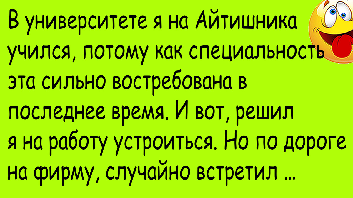 История, которая со мной недавно произошла, очень меня повеселила. Так, что я долго еще в себя прийти не мог. Короче, закончил я недавно университет. Ну и, как все выпускники, после обучения принялся искать работу. А учился я на модной в последнее время специальности, связанной с IT-технологиями. Учиться там было сложновато, конечно. Радовал только то, что после выпуска не будет проблем с работой. И верно, отдохнув пару месяцев после учебы, ч буквально за три дня нашел неплохую работу в солидной фирме. Располагалась она, правда на окраине города, но это для меня была не проблема, так как к большим расстояниям я привык. В университет я вообще ездил из пригорода. Короче, проехал целый час на маршрутке, а потом, как оказалось, надо было еще пешком пройти пару километров. Но это если по дороге. Посмотрев на карту, я сообразил, что здесь срезать можно и дорога будет в два раза меньше. Короче, пошел по дворам. И правда, уже через несколько минут увидел логотип той фирмы, в которую я хотел ус