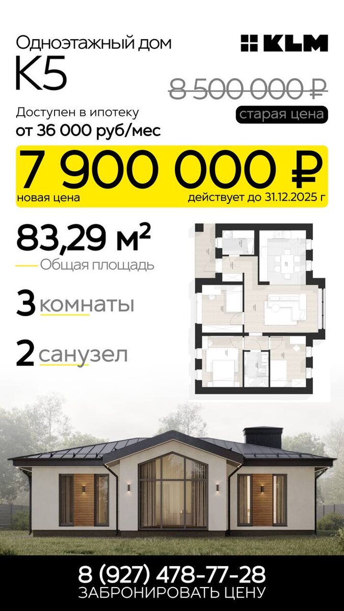 Доступная серия домов от КЛМ — серия «К» 🏠 Дома от 80 до 200 м² для комфортной жизни вашей семьи. Подобрали несколько популярных проектов с выгодным снижением цены 👇 Проект К4 — компактный и удобный • Общая площадь: 118,31 м² • Комнаты: 3 • Санузлы: 2 • Старая цена: 9 600 000 • Новая цена: 8 900 000 ₽ Проект К10 — для большой семьи • Общая площадь: 153,61 м² • Комнаты: 5 • Санузлы: 2 • Старая цена: 12 300 000 • Новая цена: 11 500 000 ₽ Проект К11 — дом повышенного комфорта • Общая площадь: 206,16 м² • Комнаты: 4 • Санузлы: 4 • Сауна: 1 • Гараж: 1 • Старая цена: 17 300 000 • Новая цена: 16 500 000 ₽ Проект К7 — уютный дом с сауной • Общая площадь: 106,18 м² • Комнаты: 3 • Санузлы: 2 • Сауна: 1 • Старая цена: 9 100 000 • Новая цена: 8 500 000 ₽ Проект К7 — компактный и функциональный • Общая площадь: 83,29 м² • Комнаты: 3 • Санузлы: 1 • Старая цена: 8 500 000 • Новая цена: 7 900 000 ₽ Забронируйте свой дом из серии «К» по сниженной цене уже сейчас 🧱 Пишите или звоните по номеру