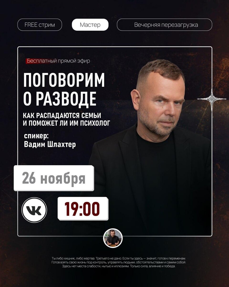 🎤Бесплатный стрим «Поговорим о разводе». Задавайте свои вопросы по теме в комментариях к этому посту — на все отвечу в прямом эфире. ⏳ 26 ноября в 19:00 (длительность до 30 минут) 🕙 Подключайся только Вконтакте. Я провожу «Вечернюю перезагрузку» каждую среду. Запись эфира выложу в частном канале. Обо мне | Благодарность команде | Навигация