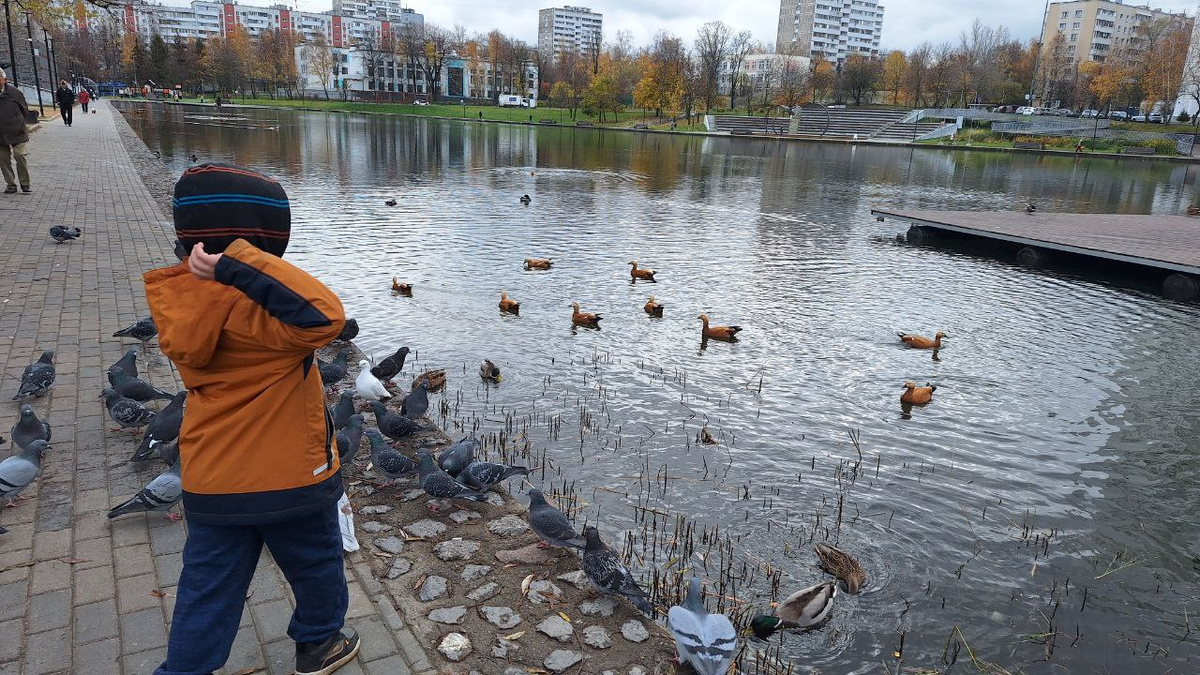 Одно из стойких заблуждений гласит, что дети-аутисты не эмоциональны. В большинстве случаев это очень далеко от истины. Ведь если ребенок не умеет проявлять эмоции, считывать чужие эмоции и реагировать на эти эмоции, если их считал - это не значит, что он не испытывает ничего сам. Поэтому важно развивать эмоциональный интеллект. Обычных детей это, конечно, тоже касается, но с ними проще - они смотрят на нас, родителей, и учатся на примере. Вот, например, забота. Пока нет возможности заботиться о себе подобных, можно позаботиться о братьсях наших меньших. Заодно и теоретический материал закрепить. Этой осенью мы дошли до деления птиц на перелетных и зимующих. Самое время пойти на пруды кормить птиц и поговорить о том, что им надо набраться сил для длительного перелета. И кряквы, и огари относятся к перелетным птицам: А зимуют у нас голуби, воробьи, снегири, вороны, дятлы и синицы. Если повезет - увидим снегиря. А еще у нас водятся дубоносы. Весной сфотографировала рядом с нашей заок