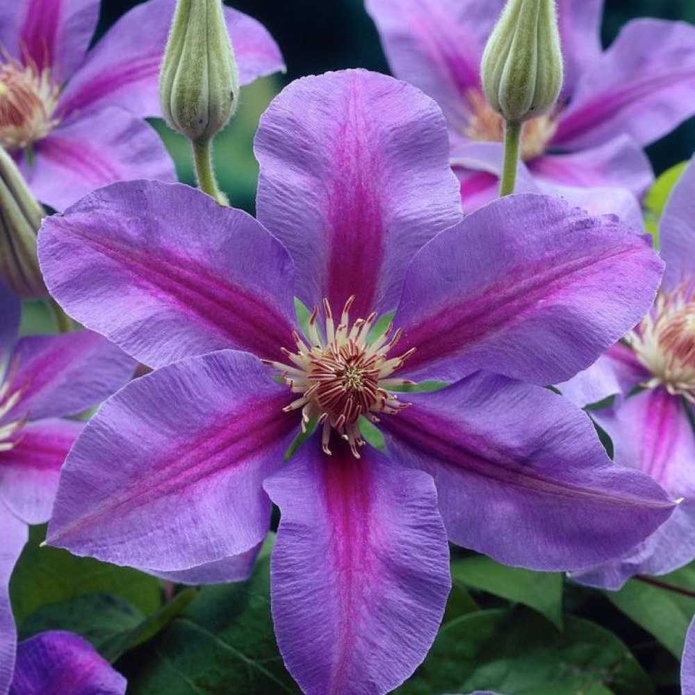 Клематис Акаиши представляет собой популярный среди садоводов многолетний японский сорт, активно используемый для вертикального озеленения территорий благодаря своей неприхотливости и эстетичности. Этот вьющийся куст достигает трех метров в высоту, отличается крупными цветами диаметром примерно 15-20 сантиметров, имеющими мягкие формы и привлекательные лепестки с волнистыми краями. Яркий окрас цветков включает насыщенный пурпурный оттенок с выразительной малиновой полосой посредине каждого лепестка, подчеркнутый контрастными пурпурными пыльниками на кремовых тычинках.