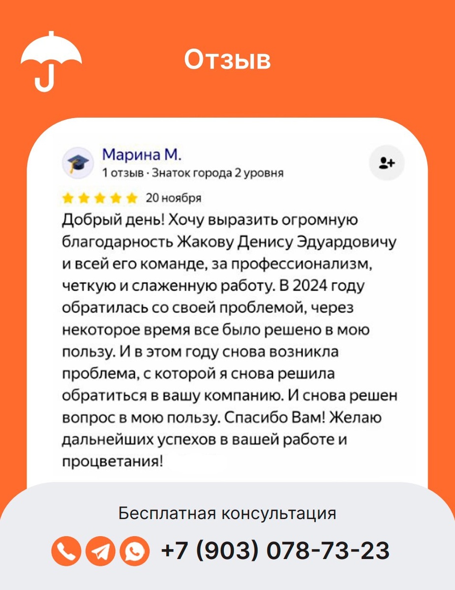 Спасибо за ваш отзыв! Ваше мнение помогает нам сохранять высокий стандарт обслуживания и улучшать качество нашей работы. С уважением, ЮК "Ваш юрист"