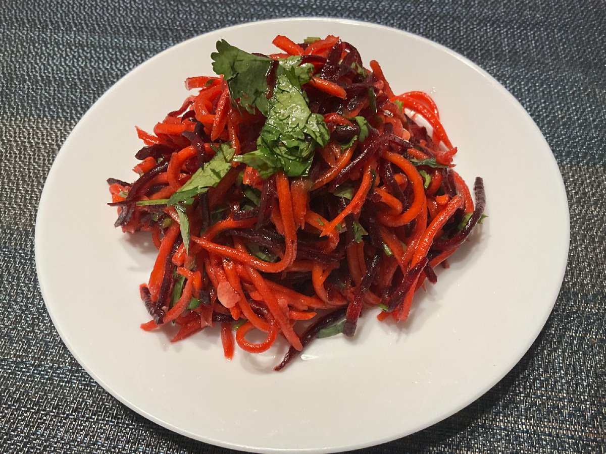 Давненько не писала рецептов, хотя готовила много всякого разного и вкусного. Исправляюсь и спешу познакомить вас с рецептом обалденного быстрого салата, который не то придумался сам, не то где-то подсмотрелся. Для начала на терке для корейской морквы нашиньгала 2 морковки и одну сырую(!) свеклу. Посолила горсткой соли, перемешала и оставила на 15-20 минут. В это время приготовила заправку из 2ст.л. растительного масла, 1ст.л. соевого соуса, 1ст.л. устричного соуса, 3ст.л.темного рисового уксуса (можете взять обычный рисовый или вообще обычный 6%), 3 рубленых зубчика чеснока, 1ст.л. сахара, 0,5ч.л. темного кунжутного масла. Нарезала несколько веточек свежей кинзы. Свеклу с морковкой промыла холодной водой, хорошенько отжала, добавила заправку и кинзу. Ну, в общем-то и всё. Перемешиваем салат и даем хотя бы полчасика настояться. Пробуйте! Ах, да- не забывайте подписываться на канал, ставить лайки, восхищаться и рекомендовать друзьям. Так салат будет еще вкуснее, а мне приятнее.