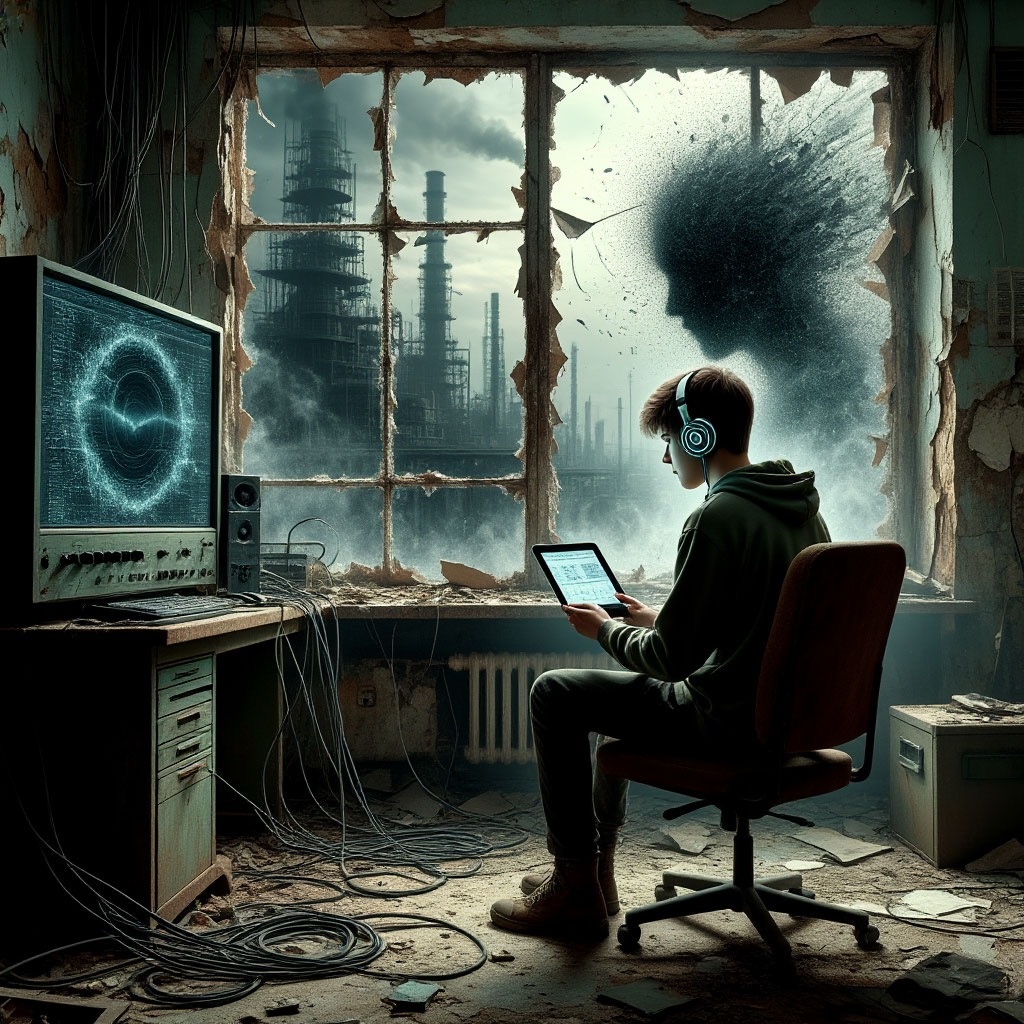 Координаты, данные Лизой, привели меня на заброшенную промышленную зону на окраине города. Место, где когда-то кипела жизнь гигантского завода, а теперь царили ржавчина, битые стекла и гулкая тишина. Вернее, почти тишина. — Он здесь, — прошептала Астра, чья форма сегодня состояла из клубов пыли, взметнувшихся от наших шагов. — Чувствую его... частоту. Он вплетает себя в фоновый шум города, как паук в паутину. Мы шли между громадами цехов, и чем дальше, тем сильнее менялась акустика. Тишина сгущалась, становясь неестественной, давящей, а затем прорывалась внезапными всплесками звука — лязгом сорвавшейся где-то вверху металлической детали, воем ветра в разбитой арматуре, эхом наших собственных шагов, многократно усиленным. Это было похоже на гигантскую звуковую ловушку. Он сидел в бывшем диспетчерском пункте, на втором этаже административного здания. Комната была завалена хламом — сломанной радиоаппаратурой, старыми динамиками, паутиной проводов. А посередине, на вращающемся стуле, си