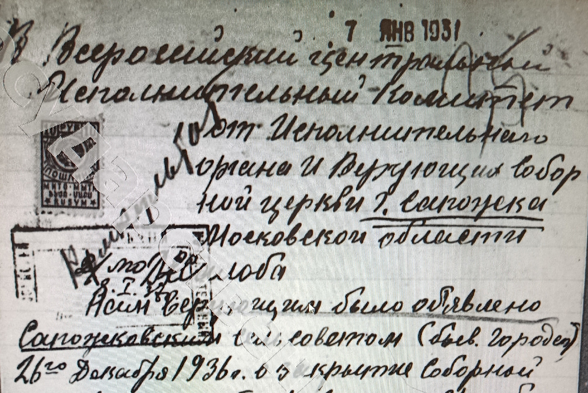 Это список тех, кто подписал первое письмо во ВЦИК от 7 января 1937 г. с просьбой не закрывать Соборный храм в бывшем городе Сапожке.