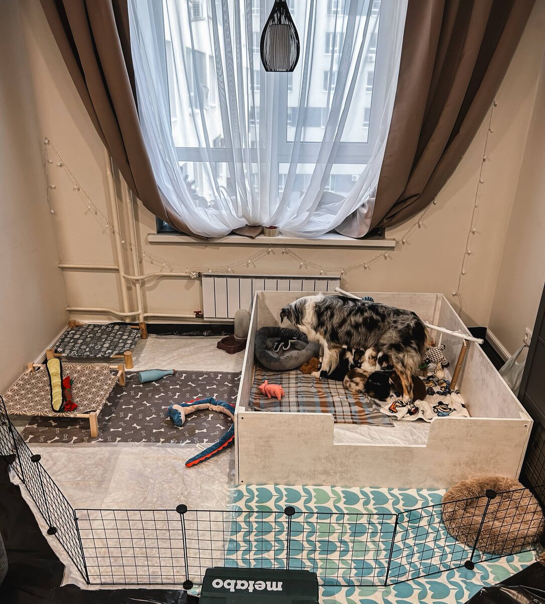 Сегодня я расширила владения маленькой стаи, щенятник пока не убираю, очень удобно убираться когда их можно туда посадить, хотя может быть