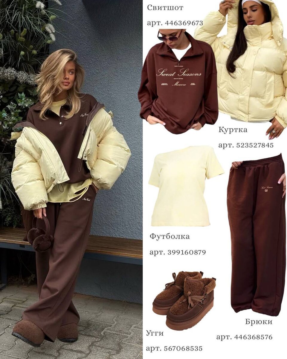 Первый комплект построен на спортивной базе: свободные шоколадные брюки, свитшот в тон, светлая футболка и объемный кремовый пуховик. Мягкие угги поддерживают уютное настроение и делают образ идеальным для долгих прогулок, дороги на учебу или неспешного шопинга.