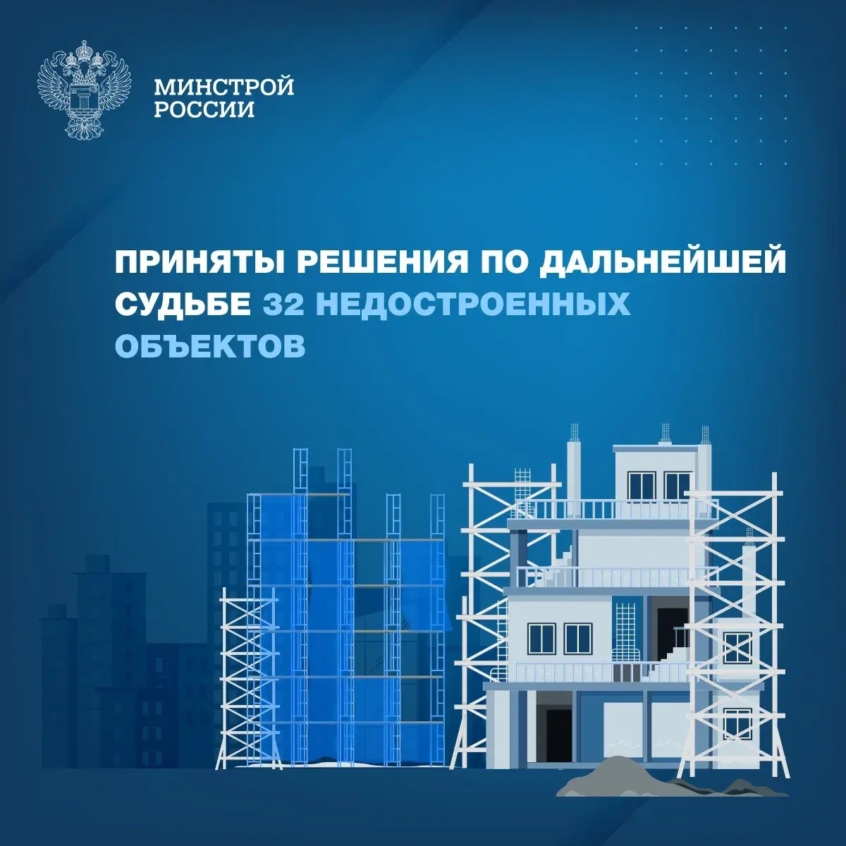 Президиум (штаб) Правительственной комиссии по региональному развитию в РФ принял управленческие решения еще по 32 недостроям, включенным в федеральный реестр объектов незавершенного строительства. Из них 14 объектов будут достроены. ➡️ В данный момент в федеральном реестре находится 781 объект от 35 ведомств. В целом на сегодня управленческие решения приняты по 780 объектам, 379 из которых будут достроены. В реестр попадают объекты, финансируемые из федерального бюджета. Информацию о них предоставляют госзаказчики, после чего ее проверяет межведомственная комиссия. «По итогам совместной работы штаба, Минстроя и заинтересованных ведомств 45 объектов на данный момент уже достроены. Внесение в реестр позволяет Президиуму (штабу) Правительственной комиссии по региональному развитию определить дальнейшую судьбу каждого объекта: достройку, продажу, снос или передачу на региональный уровень. Если принято решение о завершении строительства, для каждого из объектов разрабатывается детальны