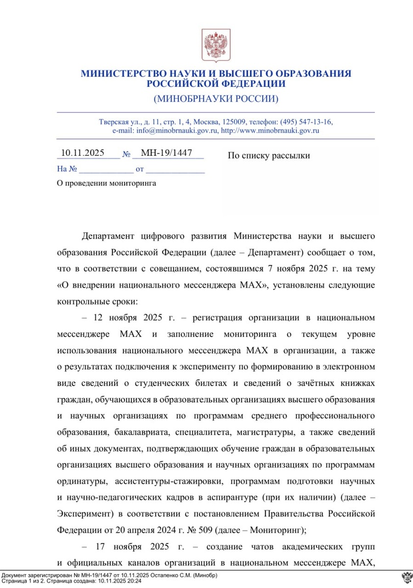 ❕▶️ Как Министерство науки и высшего образования принуждает вузы и ссузы внедрять Max и электронные документы студентов Департамент цифрового развития Министерства науки и высшего образования РФ сообщает о том, как административно-командными методами, в обход федеральных законов и подзаконных актов, в вузы внедряется мессенджер из трех букв. И не только он, а еще и ЭКСПЕРИМЕНТ с электронными студбилетами и зачетными книжками. Которые можно будет предъявлять в виде QR-кода в том же мессенджере. Ну, вы поняли. Оказывается, это можно делать и «в соответствии с совещанием» в министерстве, состоявшимся 7 ноября 2025 г., на тему «О внедрении национального мессенджера МАХ». Так вот, в соответствии с этим совещанием вузам и ссузам были установлены следующие контрольные сроки: - 12 ноября 2025 г. – регистрация организации в национальном мессенджере МАХ и заполнение мониторинга о текущем уровне использования национального мессенджера МАХ в организации, а также о результатах подключения к экс