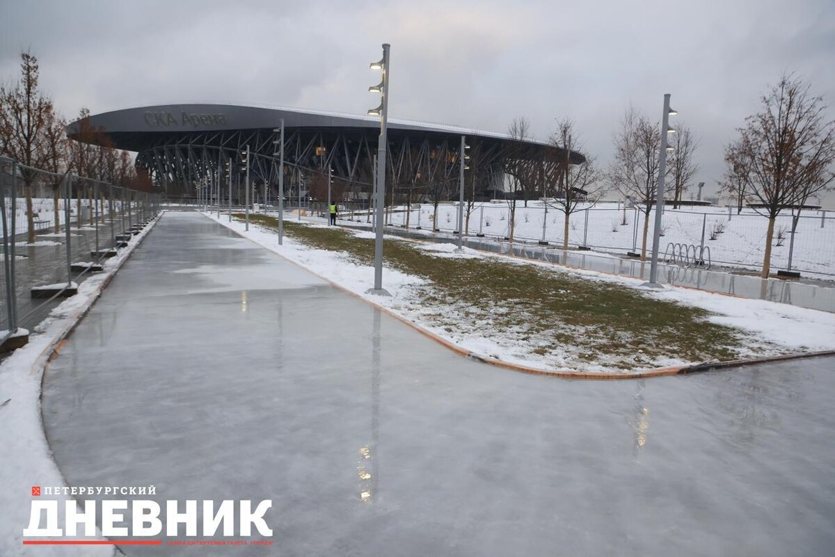 В Петербурге в воскресенье, 7 декабря, в 12:00 для горожан и гостей Северной столицы откроется уличный каток в парке у «СКА Арены». Фотограф «Петербургского дневника» Александр Глуз запечатлел, как подготавливают территорию: заливают лед, устанавливают защитные ограждения и расчищают снег. В первый день работы площадки посетить ледовую арену можно будет бесплатно – с 12:00 до 13:00. Как сообщают организаторы, каток будет работать ежедневно: в рабочие дни (будни): с 12:00 до 20:30. Первый утренний сеанс (бесплатный): с 12:00 до 13:00;