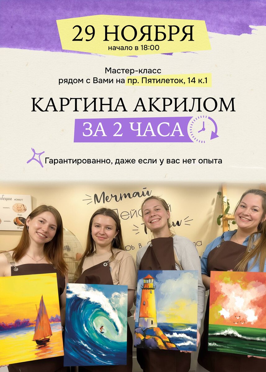 ❗️❗️❗️❗️❗️Нарисуй картину акрилом за 2 часа! ✨ Девочки мои! Срочно! Приглашаю вас на уютный мастер-класс по живописи, где каждый создаст свой собственный, завораживающий морской пейзаж 🎆 Морской пейзаж – это не просто картина. Это символ свободы, спокойствия и умиротворения. Вы не просто нарисуете красивый сюжет, вы вложите в него свою энергию и мечты о беззаботном плавании по волнам жизни! ❓ “Но я совсем не умею рисовать!” — скажете вы? И это прекрасно! Наш мастер-класс создан специально для новичков. Опытная художница с 10-летним стажем ведения арт-вечеринок проведет вас за руку: ✅ Покажет каждый шаг на большом холсте ✅ Поможет смешать идеальные оттенки ✅ Подскажет, как сделать мазки живыми и эффектными ✅ Создаст атмосферу, в которой творить — одно удовольствие! Посмотрите на фото — все эти невероятные картины созданы такими же новичками, как и вы, всего за один вечер! ЧТЛ ВАС ЖДЕТ? 29 НОЯБРЯ в 18:00 👉 2 часа арт-терапии: полное погружение в творчество под приятную музыку.