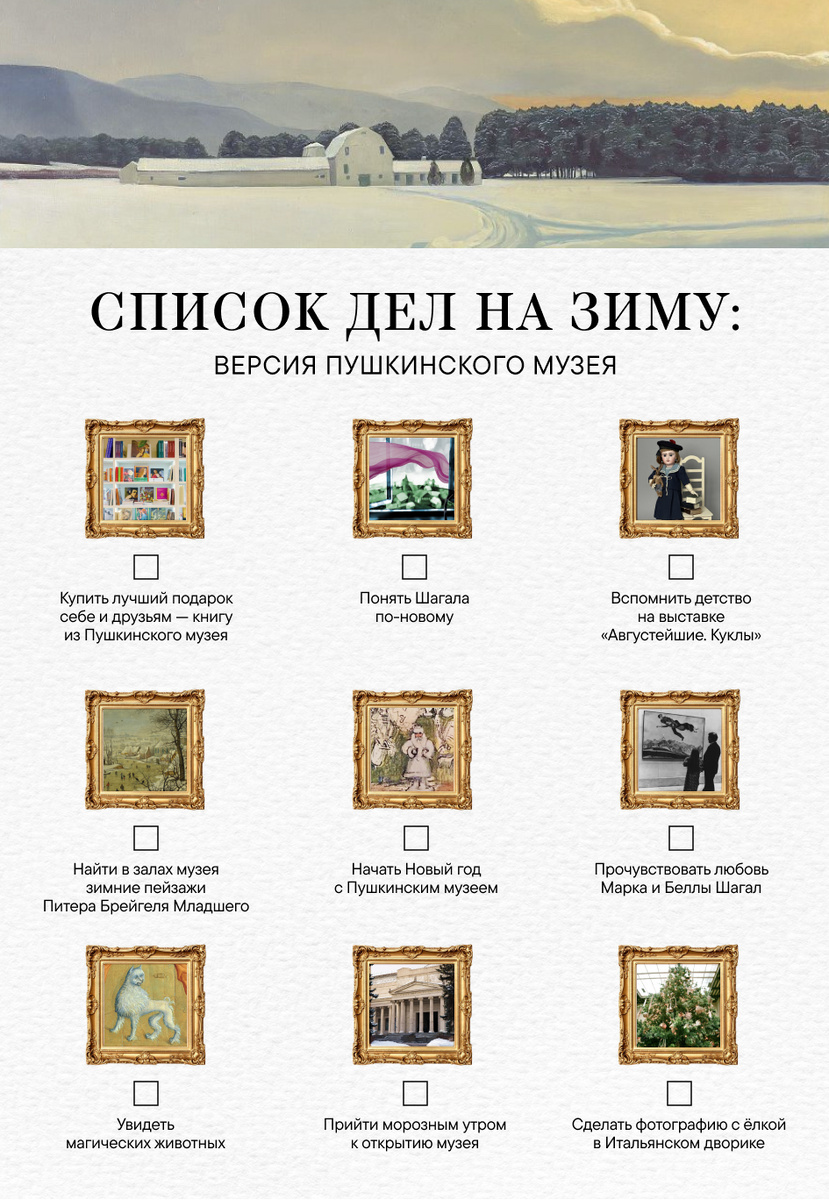 Зима только началась, а мы уже придумали список дел на любую погоду — от морозных прогулок до покупок подарков близким людям. Сохраняйте себе, делитесь с друзьями и заполняйте!