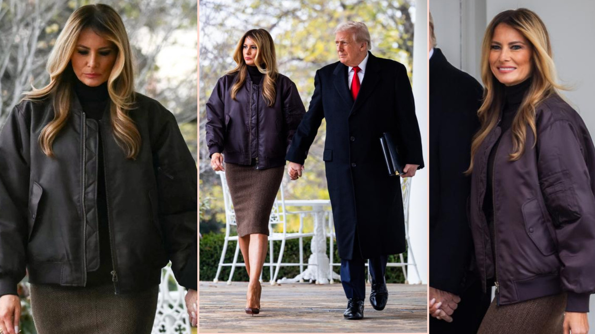 Мелании Трамп дала старт праздничным торжествам на террасе Розового сада. Первая леди появилась на ежегодном мероприятии по помилованию индюков в Белом доме, одетая в коричневый наряд. Она сочетала коричневую водолазку с твидовой юбкой-карандаш от Ralph Lauren и блестящей курткой-бомбер. Куртка в стиле "Top Gun" была похожа на кожаную версию, которую она надевала в прошлом месяце во время посещения военно-морской базы в Норфолке, штат Вирджиния. Ее медовые пряди создавали яркий контраст с темными оттенками, а пара коричневых кожаных туфель Manolo Blahnik на каблуках завершали монохромный образ. В предыдущие годы первая леди надевала на это мероприятие нарядную верхнюю одежду, в том числе пальто Stella McCartney в 2017 году и пальто Dior за 9 тысяч долларов с цветовыми блоками и черные сапоги Christian Louboutin в 2018 году. На церемонии 2019 года она была одета в коричневый тренч Burberry, а в 2020 году — в шерстяное твидовое пальто Dolce & Gabbana и коричневые и черные туфли Man