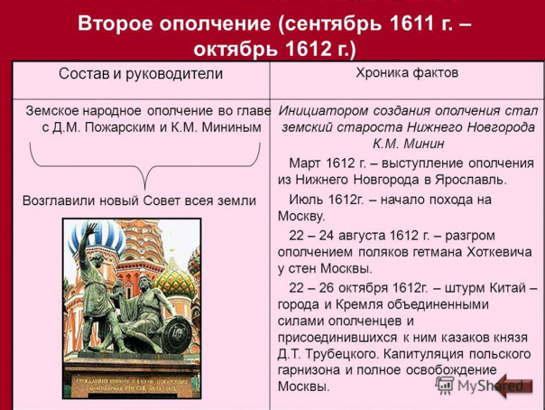 23.03.1611 г. к Москве подошла основная рать первого Земского ополчения, началась осада Кремля и Китай города. Происходили сражения с польским гарнизоном и отрядом драгун гетмана Сапеги, последнему несколько раз удавалось прорывать блокаду и подвозить продовольствие гарнизону в Кремле. При этом между Прокофьем Ляпуновым с одной стороны и Заруцким с Трубецким другой, начались разногласия, кто же среди них главный. Кончилось это тем, что казаки Заруцкого убили (очевидно, он приказал это сделать) Ляпунова, служивые дворяне после его смерти в своей основе покинули ополчение. Атаман Заруцкий предложил провозгласить будущим царем сына Лжедмитрия 2 и Марины Мнишек, некоторые историки считают, что это был его сын, что возможно, судя по его настойчивости в этом, явно не осуществимой в тот момент времени, закончившейся в последствие его смертью на колу. Никто в этом Заруцкого не подержал, поэтому он удалился в Калугу, где ожидала своей участи Марина Мнишек вместе с малолетним сыном. Но остались около Москвы несколько тысяч казаков князя Трубецкого. Они и находились у стен Москвы до подхода туда в июле 1612 г. второго Земского ополчения под командованием князя Дмитрия Пожарского и Кузьмы Минина. Это ополчение было сформировано к марту 1612 г. в Нижнем Новгороде, основу его составляло поместное служивое дворянство. Сразу после этого Пожарский и Минин направили свою рать в Ярославль, где было образовано правительство, при этом постепенно расширяя контроль над территорией, усиливая войска, собирали деньги. В момент подхода второго Земского ополчения около 14 тыс. войск, князь Трубецкой предложил объединить две рати в одно войско под его командованием. Ему в этом отказали Пожарский и Минин, указывая на смерть Прокофия Ляпунова, т.е. они не доверяли ни ему, ни его казакам. К 22.08.1612 г. к Москве подошло войска гетмана Ходкевича, около 12 тыс. в своей основе отборные кавалеристы. Началось двух дневное сражение с вторым Земским ополчением. Победа начала склоняться на сторону ляхов. Но в этот момент в тыл ляхам ударили казаки Трубецкого помимо его воли, сам он решил уклониться от сражения. Паны были разгромлены. 22-26 октября этого же года казаки Трубецкого взяли штурмом Китай город (власть РФ нас убеждает, что это произошло 22 октября по Юлианскому календарю). Через месяц из-за голода капитулировал польский гарнизон и бояре присягнувшие на верность Сигизмунду 3, в том числе дядя и сам будущий 17 летний Михаил Федорович Романов, который прекрасно понимал, что происходило. Как мной сказано ранее. Никто из бояр коллаборационистов не пострадал, благодаря заступничеству князя Пожарского и Минина, т.к. их хотели растерзать казаки Трубецкого. За это Московские бояре в будущем «отблагодарили» Кузьму Минина (фактически организатора второго ополчения) и Дмитрия Пожарского. Более того, эти же бояре усилили свою власть и фактически организовали так называемое избрание на царствие России М.Ф.Романова 3.03.1613 года. Естественно без спектакля уговоров на царствие, обойтись не могло.