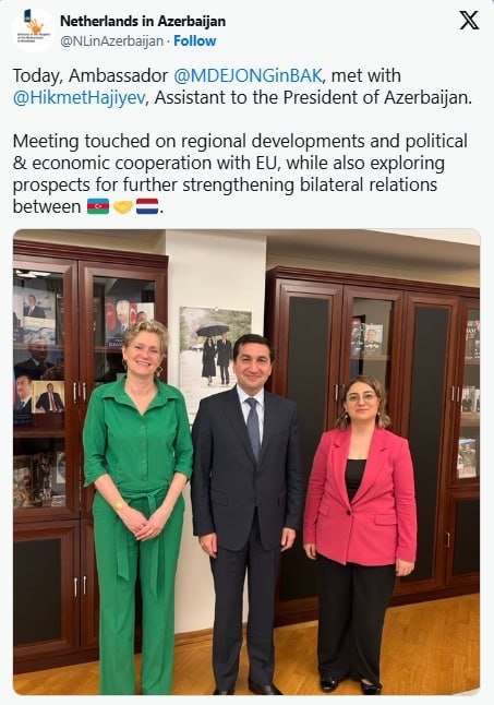 π¦πΏπ³π± ΠΠΎΠΌΠΎΡΠ½ΠΈΠΊ ΠΡΠ΅Π·ΠΈΠ΄Π΅Π½ΡΠ° ΠΠ·Π΅ΡΠ±Π°ΠΉΠ΄ΠΆΠ°Π½Π° - Π·Π°Π²Π΅Π΄ΡΡΡΠΈΠΉ ΠΎΡΠ΄Π΅Π»ΠΎΠΌ ΠΏΠΎ Π²ΠΎΠΏΡΠΎΡΠ°ΠΌ Π²Π½Π΅ΡΠ½Π΅ΠΉ ΠΏΠΎΠ»ΠΈΡΠΈΠΊΠΈ ΠΠ΄ΠΌΠΈΠ½ΠΈΡΡΡΠ°ΡΠΈΠΈ Π³Π»Π°Π²Ρ Π³ΠΎΡΡΠ΄Π°ΡΡΡΠ²Π° Π₯ΠΈΠΊΠΌΠ΅Ρ ΠΠ°Π΄ΠΆΠΈΠ΅Π² Π²ΡΡΡΠ΅ΡΠΈΠ»ΡΡ Ρ ΠΏΠΎΡΠ»ΠΎΠΌ ΠΠΈΠ΄Π΅ΡΠ»Π°Π½Π΄ΠΎΠ² Π² Π½Π°ΡΠ΅ΠΉ ΡΡΡΠ°Π½Π΅ ΠΠ°ΡΠΈΠ°Π½ ΠΠ΅ ΠΠΎΠ½Π³. Π‘ΠΎΠΎΡΠ²Π΅ΡΡΡΠ²ΡΡΡΠ°Ρ ΠΏΡΠ±Π»ΠΈΠΊΠ°ΡΠΈΡ ΡΠ°Π·ΠΌΠ΅ΡΠ΅Π½Π° Π½Π° ΡΡΡΠ°Π½ΠΈΡΠ΅ ΠΏΠΎΡΠΎΠ»ΡΡΡΠ²Π° ΠΠΈΠ΄Π΅ΡΠ»Π°Π½Π΄ΠΎΠ² Π² ΠΠ·Π΅ΡΠ±Π°ΠΉΠ΄ΠΆΠ°Π½Π΅ Π² ΡΠΎΡΠΈΠ°Π»ΡΠ½ΠΎΠΉ ΡΠ΅ΡΠΈ X. Π‘ΠΎΠ³Π»Π°ΡΠ½ΠΎ ΠΈΠ½ΡΠΎΡΠΌΠ°ΡΠΈΠΈ, Π½Π° Π²ΡΡΡΠ΅ΡΠ΅ ΡΡΠΎΡΠΎΠ½Ρ ΠΎΠ±ΡΡΠ΄ΠΈΠ»ΠΈ ΡΠ΅Π³ΠΈΠΎΠ½Π°Π»ΡΠ½ΡΠ΅ ΠΏΡΠΎΡΠ΅ΡΡΡ ΠΈ ΠΏΠΎΠ»ΠΈΡΠΈΡΠ΅ΡΠΊΠΎΠ΅ ΠΈ ΡΠΊΠΎΠ½ΠΎΠΌΠΈΡΠ΅ΡΠΊΠΎΠ΅ ΡΠΎΡΡΡΠ΄Π½ΠΈΡΠ΅ΡΡΠ²ΠΎ Ρ ΠΠ²ΡΠΎΠΏΠ΅ΠΉΡΠΊΠΈΠΌ ΡΠΎΡΠ·ΠΎΠΌ, Π° ΡΠ°ΠΊΠΆΠ΅ ΠΏΠ΅ΡΡΠΏΠ΅ΠΊΡΠΈΠ²Ρ Π΄Π°Π»ΡΠ½Π΅ΠΉΡΠ΅Π³ΠΎ ΡΠΊΡΠ΅ΠΏΠ»Π΅Π½ΠΈΡ Π΄Π²ΡΡΡΠΎΡΠΎΠ½Π½ΠΈΡ