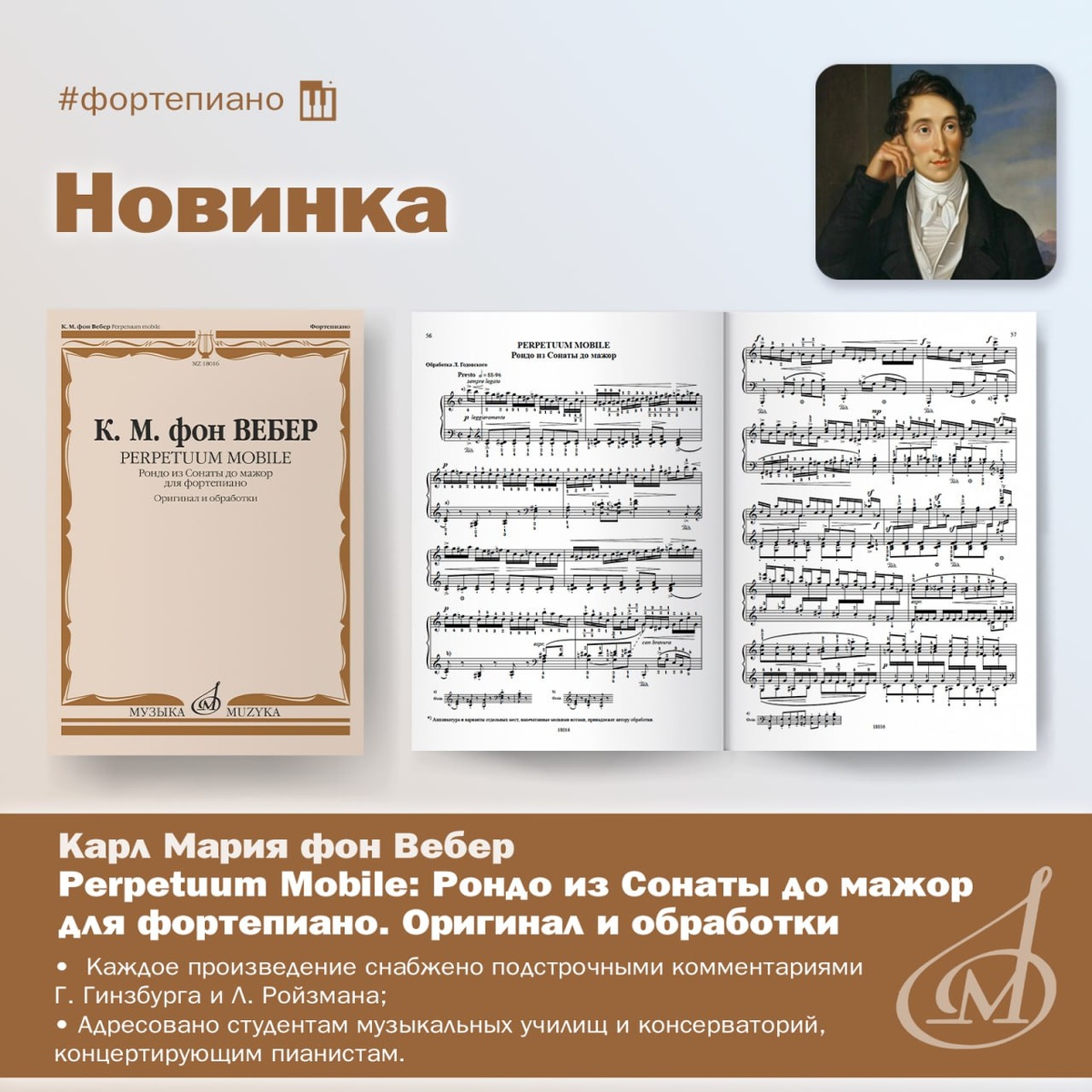 📎К. М. Вебер. Perpetuum Mobile. Рондо из Сонаты до мажор Рассказываем о новом издании, которое объединяет оригинал и ряд обработок. Каждая пьеса снабжена подстрочными комментариями Г. Гинзбурга и Л. Ройзмана. ⏺️Карл Мария фон Вебер (1786–1826) известен миру не только как композитор-романтик, пианист, дирижёр, но и как основоположник немецкой романтической оперы. Свою Первую сонату для фортепиано до мажор, op. 24 он создал в 1812 году, в возрасте двадцати шести лет. Произведение было посвящено великой княгине Марии Павловне Саксен-Веймарской — дочери российского императора Павла I. ⏺️Финал сонаты построен на безостановочном движении шестнадцатыми нотами в быстром темпе. Сам Вебер дал ему название «L'infatigable» («Неутомимый»), однако в фортепианный репертуар — благодаря французскому пианисту-виртуозу Шарлю Алькану (1813–1888) — он вошёл именно как «Perpetuum mobile» («Вечное движение»). Сочинение предъявляет исполнителю чрезвычайно высокие технические требования: отчасти это объясн