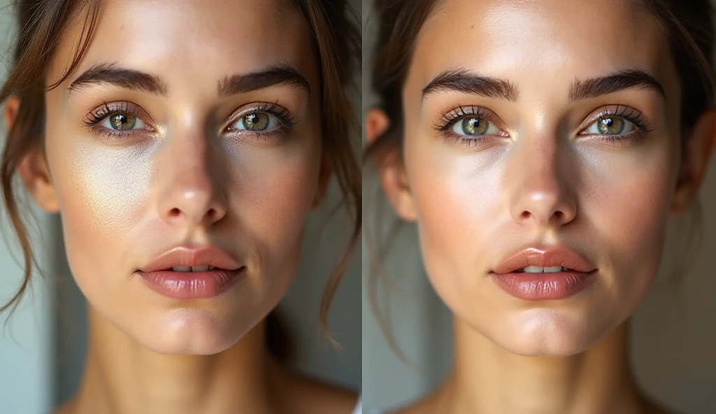 - Отдайте предпочтение легким тонирующим средствам: флюидам, ВВ-кремам, тональным тинтам. Их назначение — не спрятать, а выровнять тон и придать коже сияние. Наносите их только на центральную часть лица (нос, подбородок, центр лба, где обычно краснота и неровности выражены сильнее) и аккуратно растушевывайте кистью или влажным спонжем к периферии. Не нужно покрывать все лицо сплошным слоем — виски и область вокруг глаз часто в этом не нуждаются.