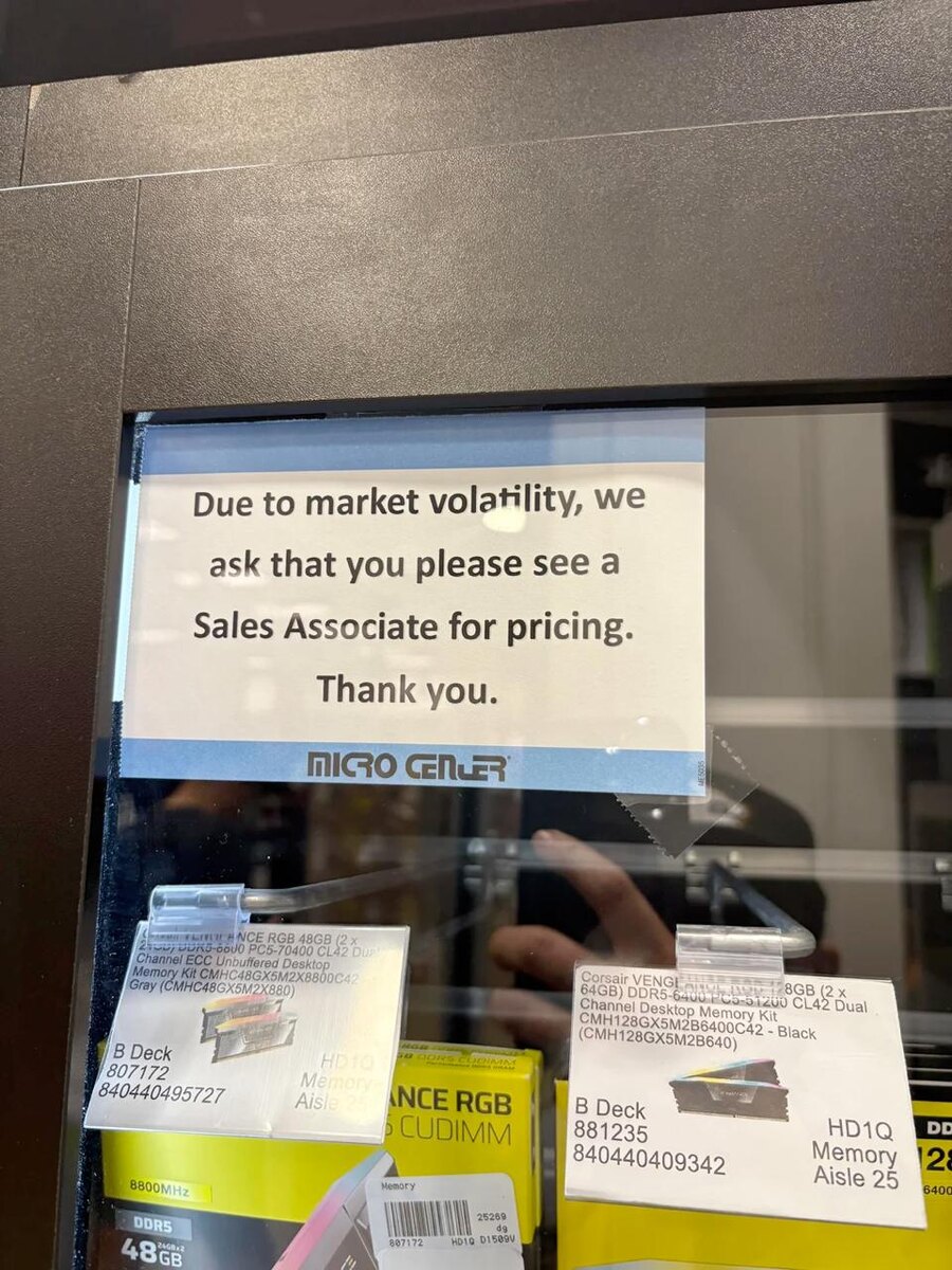 Кризис ОЗУ уже такой, что в магазинах сдались — ценники на память больше не меняют В крупных сетях США вроде Central Computers и Microcenter покупатели теперь просто спрашивают цену у менеджера — она успевает измениться за минуты. Комплект из двух планок по 32 ГБ уже улетел до $1200 (почти 95 тыс. ₽). Эксперты говорят, это только разгон: память дорожает быстрее биткоина, а сборка ПК превращается в роскошь. Жесть. Как вы выкручиваетесь: апгрейд откладываете, переходите на DDR4 или берёте по любой цене? #Techtaim