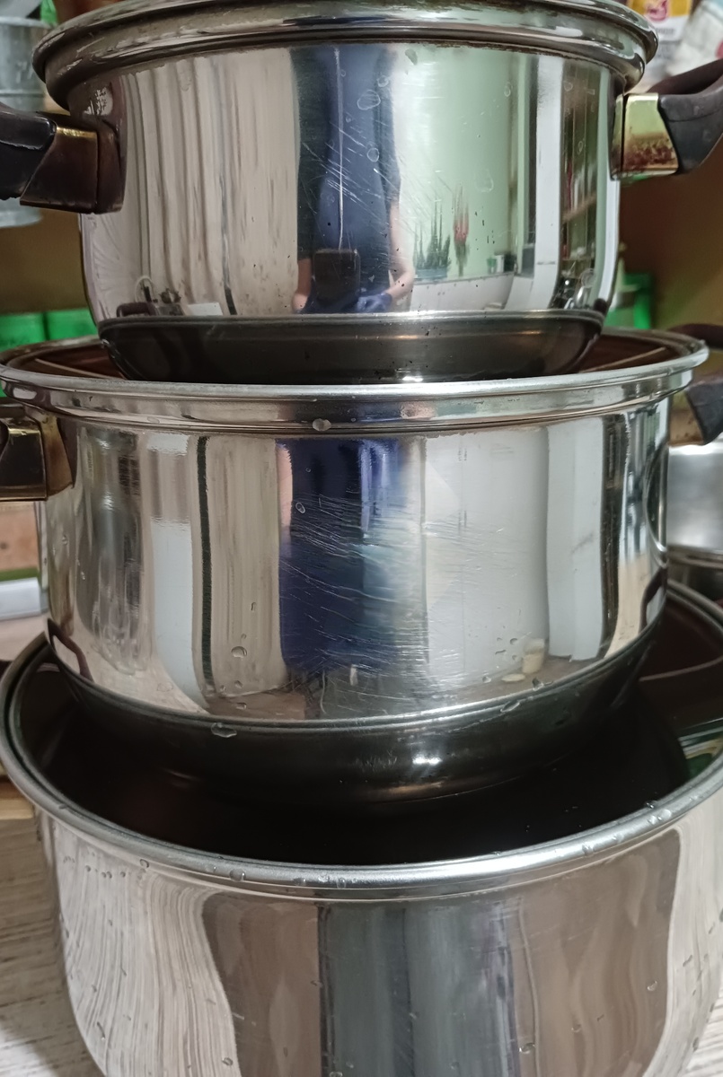 Затем кастрюли, сковороды.