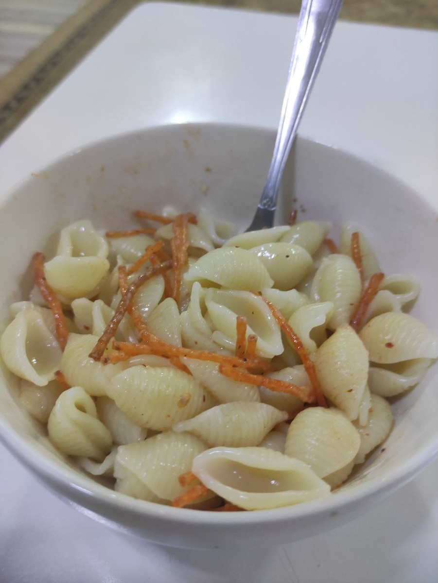 Макароны с китайскими остро-сладкими снеками из пшеницами. Выходит не слишком остро и не слишком безвкусно