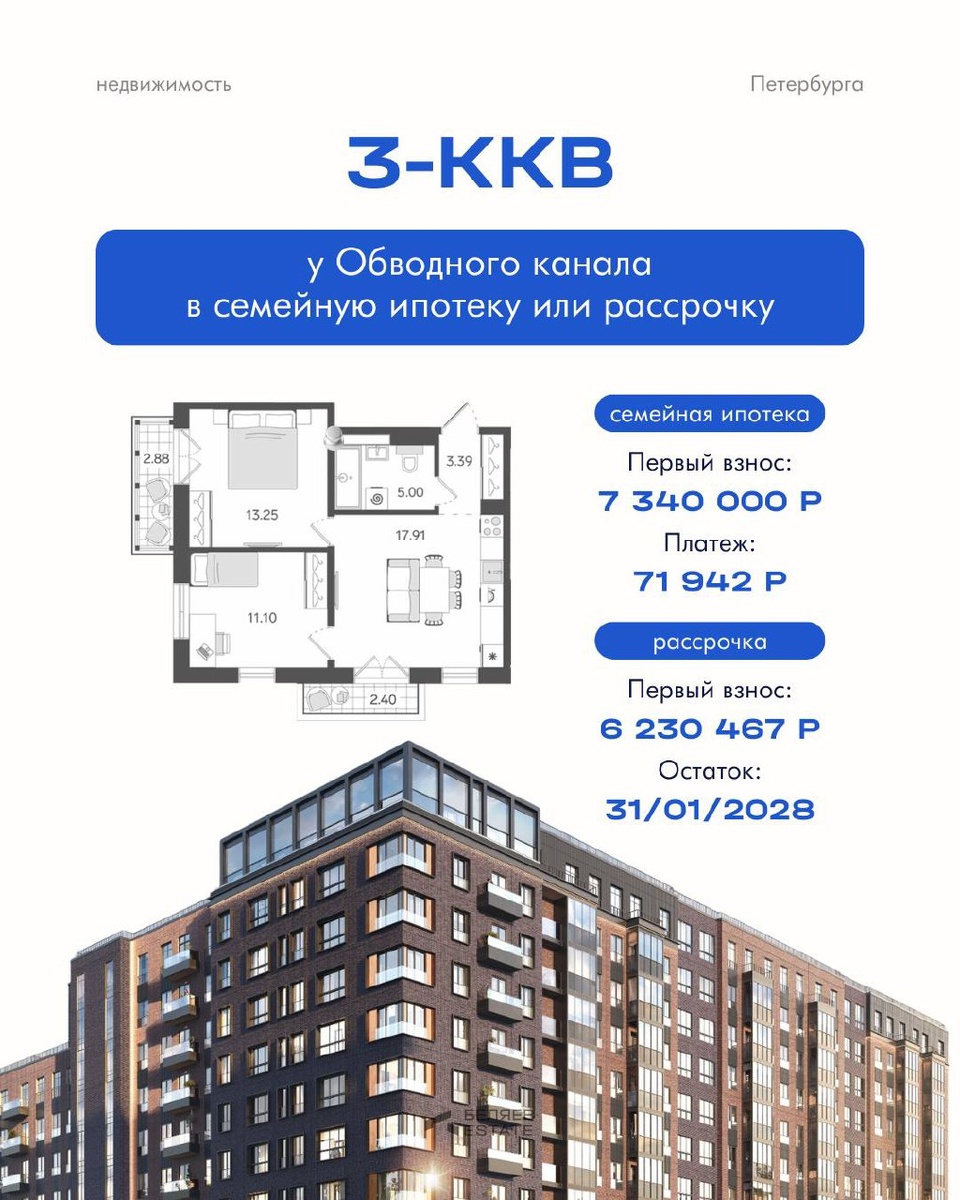 💥 Семейная 3-ЕВРО у Обводного: в ипотеку или рассрочку Информация о проекте в нашем обзоре Сейчас доступны два сценария — семейная ипотека или рассрочка, каждый со своими преимуществами. Кому подойдёт рассрочка: ▪️тем, кто продаёт вторичку, держит средства на вкладе или хочет зафиксировать квартиру сейчас, а остаток внести позже — без переплаты банку и с возможностью заработать на росте цены. Пример расчётов по двум вариантам — в карточке к посту 👆🏻 Если хотите сравнить сценарии под вашу ситуацию или подобрать другие варианты в этой локации — пишите Беляев.Estate.