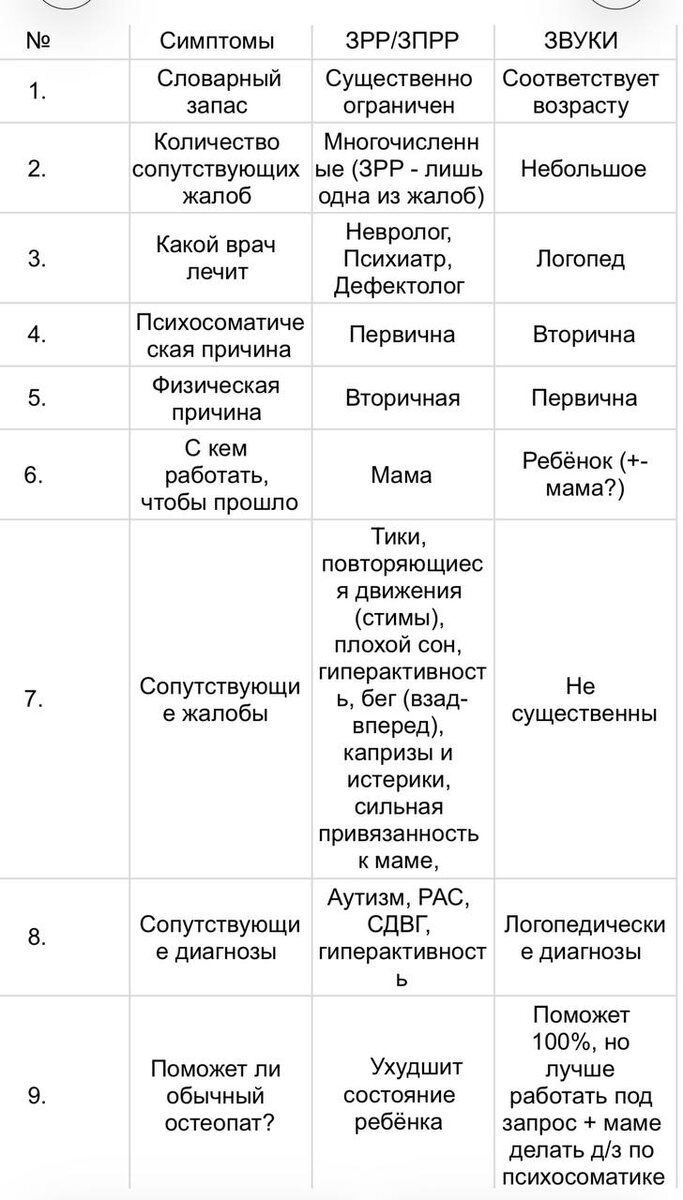 Сравнительная таблица ЗРР/ЗПРР и Звуки Речи (Р, Ш, Л и др.) ☝🏻 Важно: Если Вы корректируете у своего ребёнка Звуки, а у него ЗРР/ЗПРР, то Вы вредите его здоровью! Потому что, с тз Психосоматика, «молчание» - это адаптация к тем условиям (схема ситуации), в которых находится ребёнок: ♦️ речь не понадобится; ♦️ молчать чтобы не заметили #зрр #зпрр #зпрр@osteopat_legoshin #зрр@osteopat_legoshin