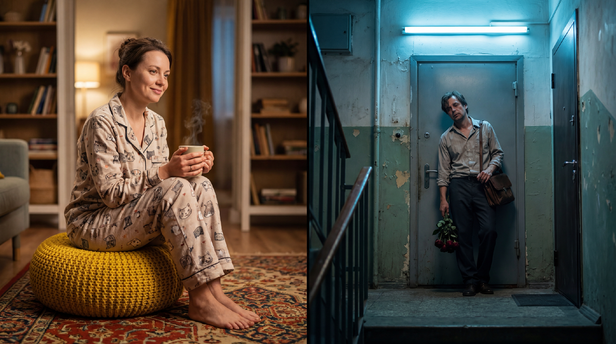Линза искажала, но не настолько, чтобы я не разглядела суть. Сергей стоял, привалившись плечом к грязной стене подъезда. В руках — тот самый кожаный саквояж, с которым он уходил полгода назад. Только теперь кожа на углах потерлась, а сам он выглядел так, будто неделю спал в поездах. Под глазами залегли темные тени, дорогая рубашка выбилась из брюк. В правой руке он сжимал букет роз в шуршащей пленке. Бутоны уже начали клониться вниз, словно даже цветам было неловко участвовать в этой сцене.