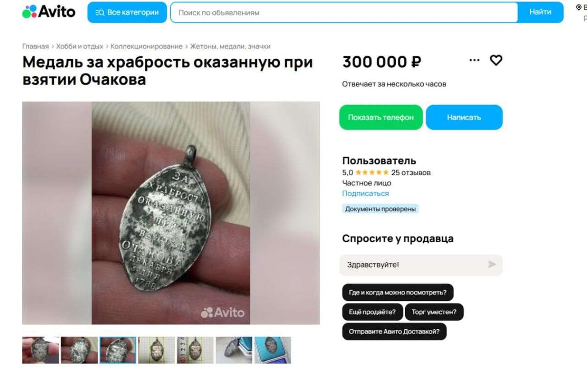 На 500 тысяч рублей за два месяца подешевела выставленная на продажу в Воронеже медаль «За храбрость, оказанную при взятии Очакова». Стоимость старинной награды обновили на сайте объявлений «Авито» в пятницу, 21 ноября. Напомним, что еще в конце сентября текущего года за раритет XVIII века просили 800 тысяч рублей. Теперь же собственник готов расстаться с серебряной медалью, учрежденной в 1789 году по указу императрицы Екатерины II, уже за 300 тысяч рублей. Как «Обозреватель.Врн» сообщал ранее, обладателями солдатской награды стали свыше 15 тысяч участников осады и штурма крепости Очаков в период Русско-турецкой войны 1787-91 годов. Эту медаль носили на ленте Ордена Святого Георгия Победоносца.