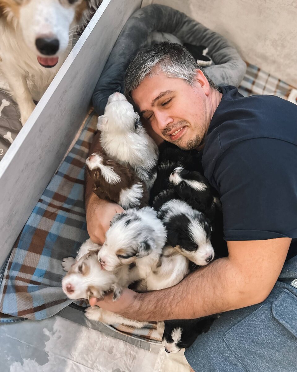 Распечатаю и повешу на стену 😂 Мой муж, который не хочет больше собак 😂😂 Лежит в мокром от мочи щенятнике, и посмотрите, ну сколько счастья на его лице!!!! 😂😂💔💔💔 Миша, я знаю ты читаешь! Люблю тебя! 🥹💔💔