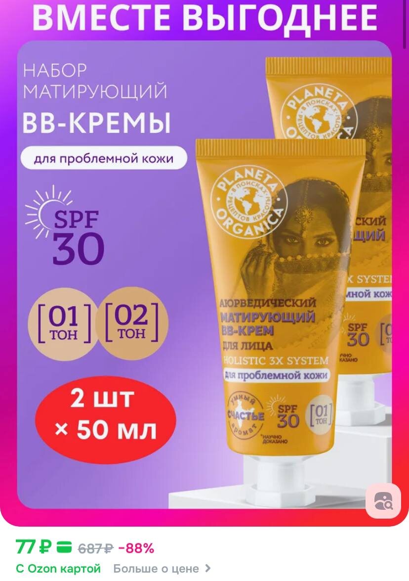 Planeta Organica Holistic 3x system Аюрведический Тональный BB-крем для лица матирующий SPF 30, ВВ крем для проблемной кожи, Тон 01 + Тон 02, 2 шт х 50 мл https://ozon.ru/t/LtBhM2w ✅ Подписаться 🔣 Бот с промокодами
