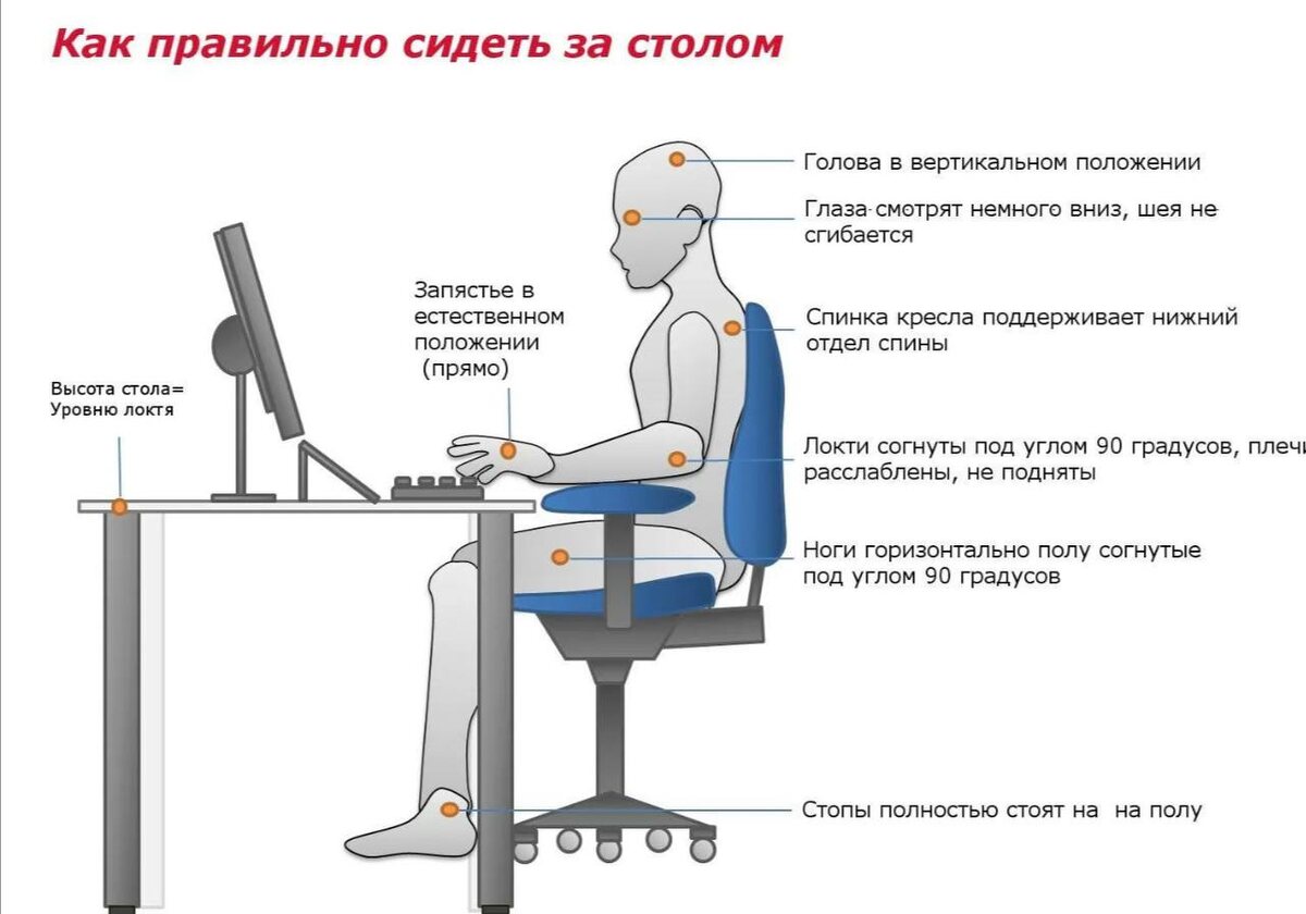 Правильное положение тела во время работы за компьютером поможет снизить нагрузку на позвоночник, мышцы и суставы. Некоторые рекомендации: Отрегулировать высоту стола. Оптимальная высота — 70–75 см, но рост у людей разный, поэтому нужно отталкиваться от правила: чем больше рост, тем выше стол. Опираться спиной на спинку кресла. Между телом и бёдрами должен образоваться угол примерно 105–120°. Для дополнительной поддержки можно положить под поясницу валик или небольшую подушку. Держать голову в правильном положении. Шея должна находиться в вертикальном положении, её не стоит наклонять вперёд или запрокидывать назад. Направление взгляда — прямо на экран или немного вниз. Правильно поставить ноги. Ступни стоят на полу параллельно друг другу, а между бедром и голенью угол 90°. Не стоит скрещивать или поджимать под себя ноги. Найти правильное положение для рук. Оптимальная высота стола — такая, чтобы руки лежали на нём под углом 90°. Подлокотники стула должны находиться на уровне л