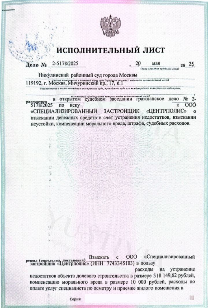📘Получен исполнительный лист по Застройщику: ООО "СЗ "ЦЕНТРПОЛИС" ➿➿➿➿➿➿➿➿➿➿ О взыскании компенсации за строительные недостатки по договору долевого участия Никулинский районный суд г. Москвы Дело: 02-5178/2025 Площадь: 73,86 м² Судья: Юдина И.В. ➿➿➿➿➿➿➿➿➿ Взысканные суммы: ➡️Недостатки: 518 149,62 руб; ➡️Моральный вред: 10 000 руб; ➡️Суд. расходы: 112 648,08 руб. ➿➿➿➿➿➿➿➿➿ 💸Итого: 640 797,70 рублей. ❤️Приёмка квартиры и строительно-техническая экспертиза за счёт компании! Юстивия – мы на вашей стороне в борьбе за справедливость!🆗 ➿➿➿➿➿➿➿➿➿ 📞+7 (936) 333-33-48 ✅@Yustivia 🌐yustivia.ru