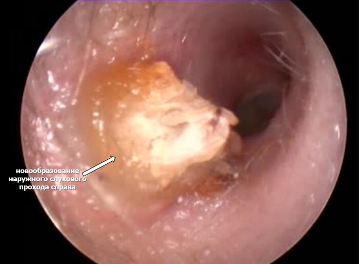 Всем привет, ЛОР-хирург на связи! Хочу поделиться с вами одним интересным случаем из практики. Ко мне на приём пришёл мужчина, 35 лет, с жалобой на банальный дискомфорт в правом ухе. Ни стреляющей боли, ни гноя — просто что-то мешало. Заглядываю в ухо с помощью отоскопа и вижу вот такое. Обнаружилось новообразование, приличное такое. Направляем пациента на КТ височных костей — нужно понять, что это за "зверь" и насколько глубоко он забрался. Результаты КТ нас и обрадовали, и озадачили. Эта штука успела подпортить (вызвать эрозию) костную стенку слухового прохода. Хорошая новость — признаков агрессивного, инвазивного роста не было (посмотрите потом видео, там всё наглядно). Но расслабляться было рано. Хотел бы сказать что мы собрали консилиум, пообсуждали, но по факту в одну калитку принято решение что нужно выполнить эксцизионную биопсию. То есть я хирургически, аккуратненько, в пределах здоровых тканей удаляю эту штуку, и отправляю удалённое на гистологию. А пока: И вот он, сюрприз! Г