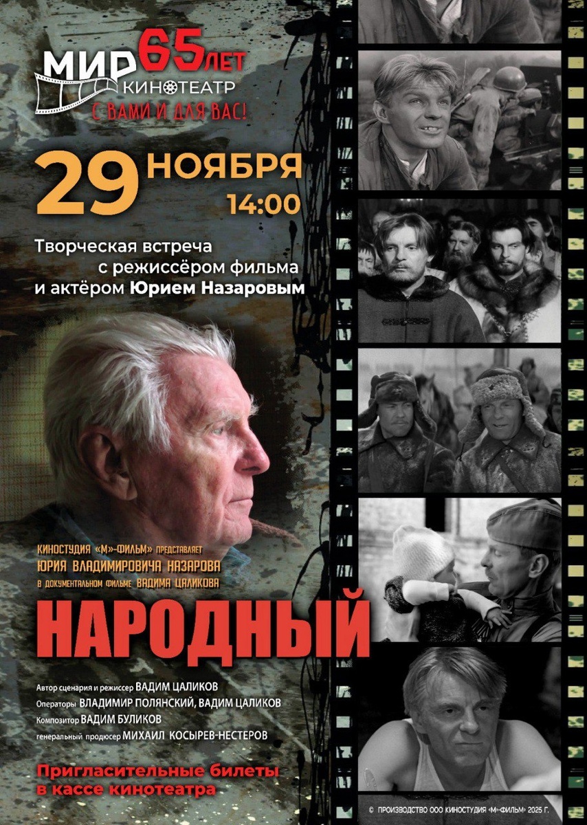 🎉 Первому кинотеатру Обнинска – 65 лет! 65 лет назад в Обнинске для зрителей распахнулись двери первого широкоэкранного кинотеатра «Мир», положив начало долгой истории кинопоказов, встреч и незабываемых эмоций. 29 ноября кинотеатр отметит свой юбилей. Для жителей города подготовили праздничную программу. Пройдёт творческая встреча с народным артистом России, героем советского и российского кино Юрием Назаровым и показ документального фильма «Народный». Начало в 14:00. Вход по бесплатным пригласительным билетам, которые можно получить в кассе кинотеатра «Мир». #обнинсккультурный