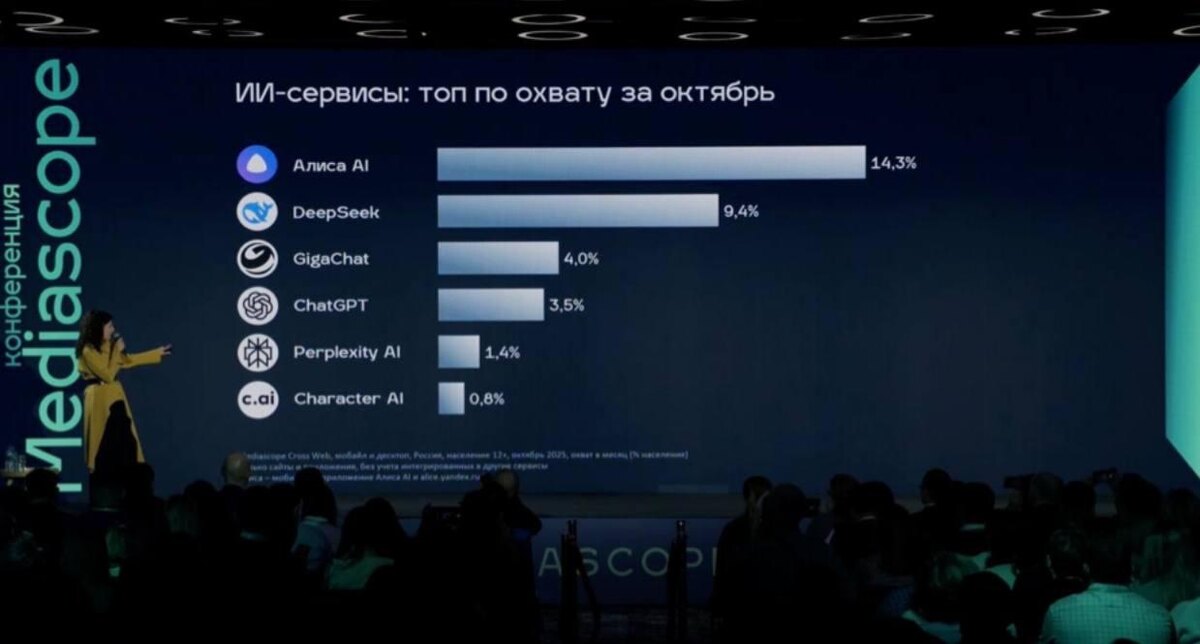 14,3% россиян выбрали Алису Mediascope опубликовал свежую статистику по популярности ИИ-ассистентов в России — и впервые уверенно лидирует отечественный продукт. Алиса AI от Яндекса стала самой используемой нейросетью в стране: ей пользуются 14,3% населения. Для сравнения: у DeepSeek — 9%, у GigaChat — 4%, у ChatGPT — примерно 3,5%. Это важный момент — еще весной рынок выглядел иначе, и уверенно лидировали зарубежные модели. Теперь впервые российский ИИ стал лидером массового сегмента. Причины понятны: • Алиса говорит по-русски естественнее, чем зарубежные модели • не требует VPN — критично для массового пользователя • легко оплачивается • понимает бытовые и практичные запросы, а не только «умные» Решающим моментом стало обновление Алисы AI — оно превратило её в самую быстрорастущую нейросеть. Только за первую неделю приложение скачали полтора миллиона раз, что в сегменте ИИ — редкий случай. По сути, Яндекс сумел сделать то, что все пытаются сделать, но далеко не у всех выходит: п