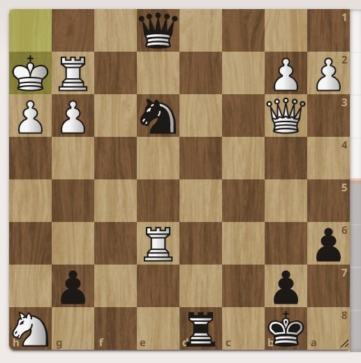 Белые имеют лишнюю ладью. Однако ход черных, мат в несколько ходов. Первый верный ход в галерее.
