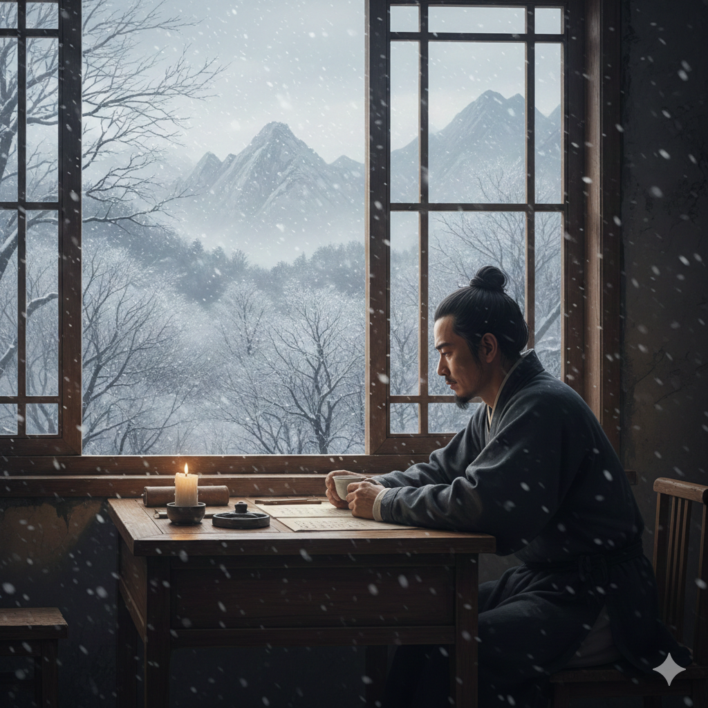 Снег, только снег... В дом задувает, подступает стужа. Оригинал на китайском: