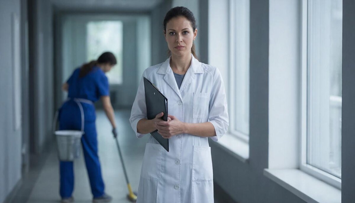 В то утро всё было как всегда. Я поднялась на третий этаж, где шли плановые операции, и машинально отметила: лампы горят, тишина, дежурная сестра на месте. Пол блестит так, что хоть в нём отражайся. И вдруг заметила у окна согнутую фигуру в синей униформе уборщицы. Женщина яростно тёрла шваброй крошечное пятно на керамограните, будто оно олицетворяло собой всю несправедливость мира.